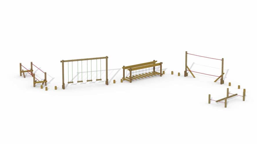 Combinatie van de speeltoestellen Hercules (A640), Robin Hood (A620), Waggelpad (S360), Zorro (A630), Buffalo Bill (A650) en 10 stappaaltjes (A690). Dankzij de beperkte valhoogte van deze reeks speeltoestellen mag het avonturenpad op gras geplaatst worden.