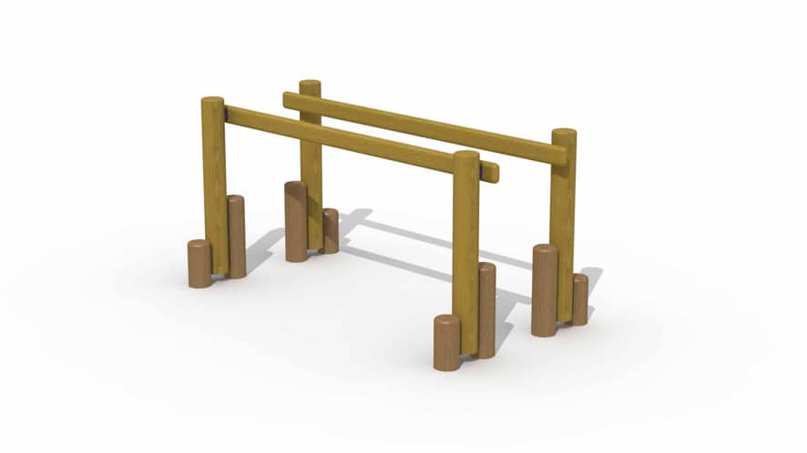 Avontuurlijk speeltoestel voor kinderen van 4 tot 15 jaar. Het toestel is opgebouwd uit 4 verticale rondhouten lariks palen van 12 cm diameter en 1 m hoog die elk gesteund worden door 2 kleinere rondhouten eiken palen met dezelfde diameter. Tussen deze palen worden 2 lariks balken (leuningen) van 2 m evenwijdig met elkaar en op een afstand van 80 cm gehangen. Men kan aan de overkant geraken door zich al steunend op de balken te verplaatsen. Alle moeren en bouten worden afgeschermd met kunststof afdekdoppen. Dit toestel wordt via de eiken palen rechtstreeks met beton in de grond verankerd.