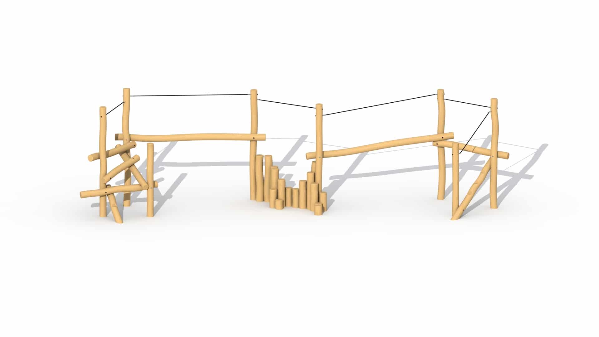 Loopbrugparcours voor kinderen van 4 tot 12 jaar in robinia. Het speeltoestel is een combinatie van klimmen en evenwicht. Boven de loopbruggen wordt er een touw in staalkabel gespannen waaraan de kinderen zich kunnen vasthouden terwijl ze het parcours overbruggen. Dit speeltoestel wordt uitgebreid met stappalen. Alle moeren en bouten zijn volledig afgeschermd. De gehele constructie wordt rechtstreeks met beton in de grond verankerd.