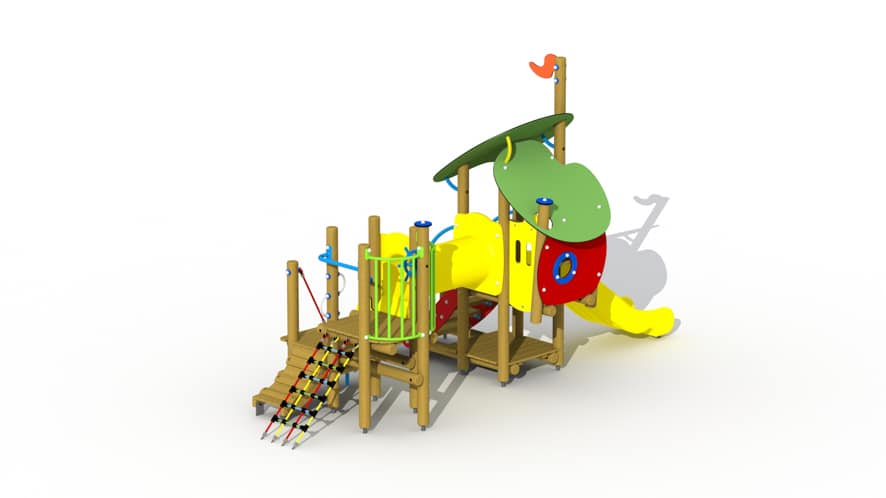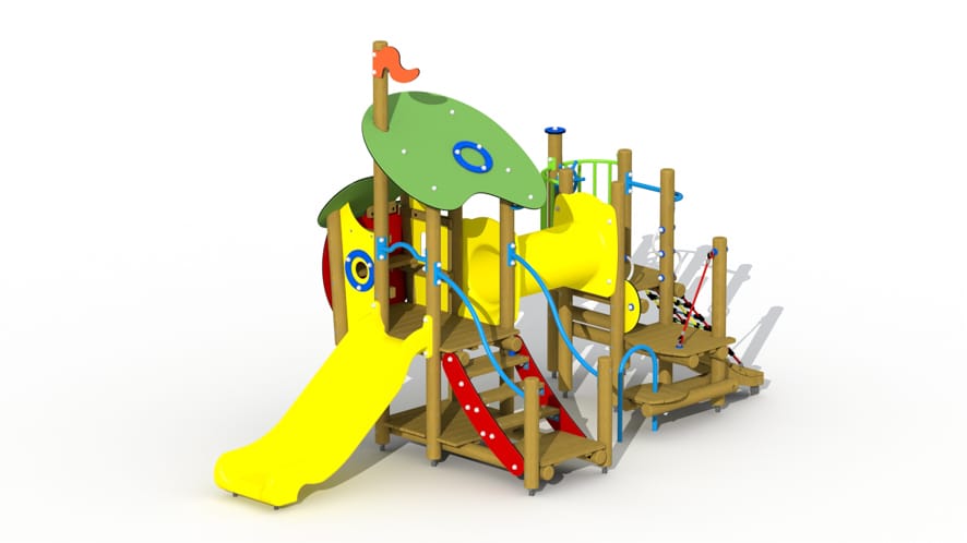 Kleurrijk combinatietoestel voor kinderen van 2 tot 6 jaar. Het speeltoestel bestaat uit een speelhuisje met een platformhoogte van 84 cm waarvan een inox glijbaan met HDPE polyethyleen glijbaanboorden vertrekt. Het speelhuisje kan betreden worden via een gemakkelijke trap met metalen leuningen. Onderaan is een speelvloer voorzien en bovenaan in het huisje is een bankje voorzien, het geheel wordt overdekt door een 2-ledig dak uit afgeronde kleurrijke HDPE polyethyleen panelen. Vanuit het speelhuis kan via een dubbelwandige HDPE polyethyleen doorkruipbuis naar een open platform gekropen worden. Aan het platform is een balustrade voorzien met kleurrijke metalen hekjes waaraan een kunststof stuur gemonteerd is. Het platform kan bereikt worden via een klauternet en een tweeledige platformtrap met metalen buisleuning en klimboog.