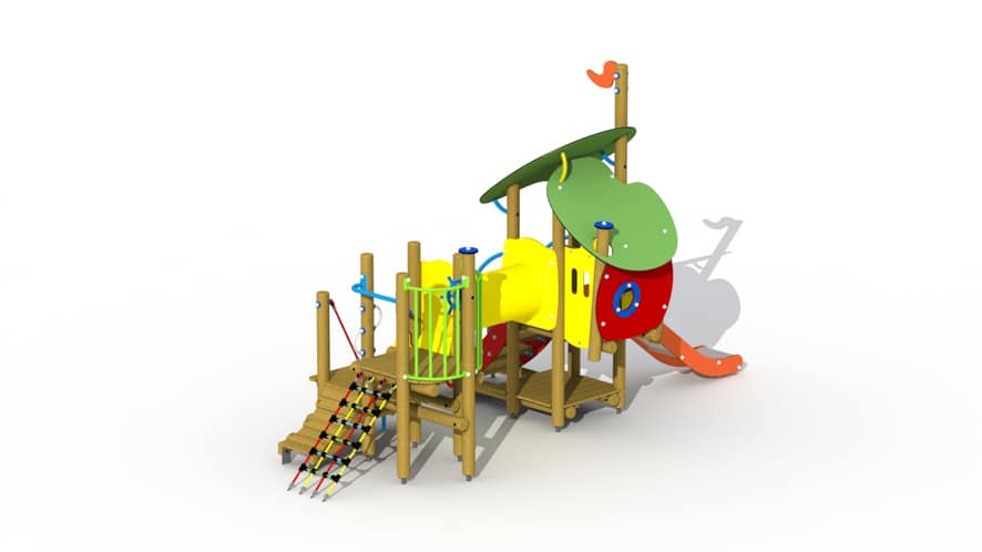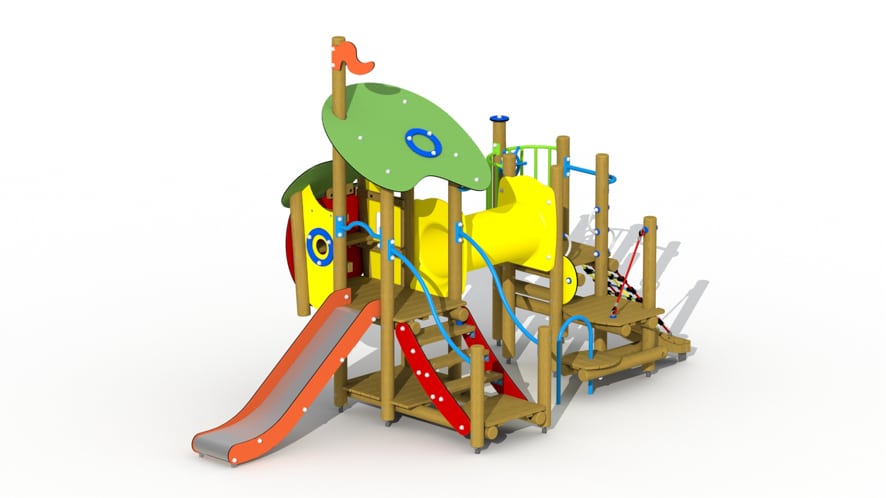 Kleurrijk combinatietoestel voor kinderen van 2 tot 6 jaar. Het speeltoestel bestaat uit een speelhuisje met een platformhoogte van 84 cm waarvan een inox glijbaan met HDPE polyethyleen glijbaanboorden vertrekt. Het speelhuisje kan betreden worden via een gemakkelijke trap met metalen leuningen. Onderaan is een speelvloer voorzien en bovenaan in het huisje is een bankje voorzien, het geheel wordt overdekt door een 2-ledig dak uit afgeronde kleurrijke HDPE polyethyleen panelen. Vanuit het speelhuis kan via een dubbelwandige HDPE polyethyleen doorkruipbuis naar een open platform gekropen worden. Aan het platform is een balustrade voorzien met kleurrijke metalen hekjes waaraan een kunststof stuur gemonteerd is. Het platform kan bereikt worden via een klauternet en een tweeledige platformtrap met metalen buisleuning en klimboog.