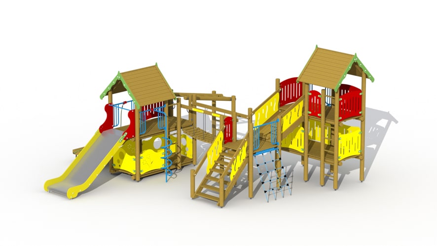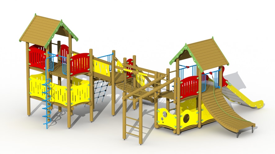 Combinatie van de jumbo uitkijktoren (S431), de vesting (S600) en het schuin platform (S706) met aanbouwelementen apenladder (S005), klimboog (S006), aanbouwnet (S013), lage spiraalglijstang (S014), hoge spiraalglijstang (S018) en lage inox glijbaan (G112). Extra opties zijn twee zitbankjes en een tafeltje (S001), toog met telraam (S003), rotswand (S007), lage glijstang (S008), zandwerkplaats (S009), zitbalk met 3 zittingen (S019), educatieve spelpanelen (S033-S038), kunststof spiraalglijbaan (G402) of hoge inox glijbaan (G121).Dit speeltoestel is verkrijgbaar met rode en gele zijwanden of met groene en gele zijwanden. Vraag naar onze mogelijkheden!