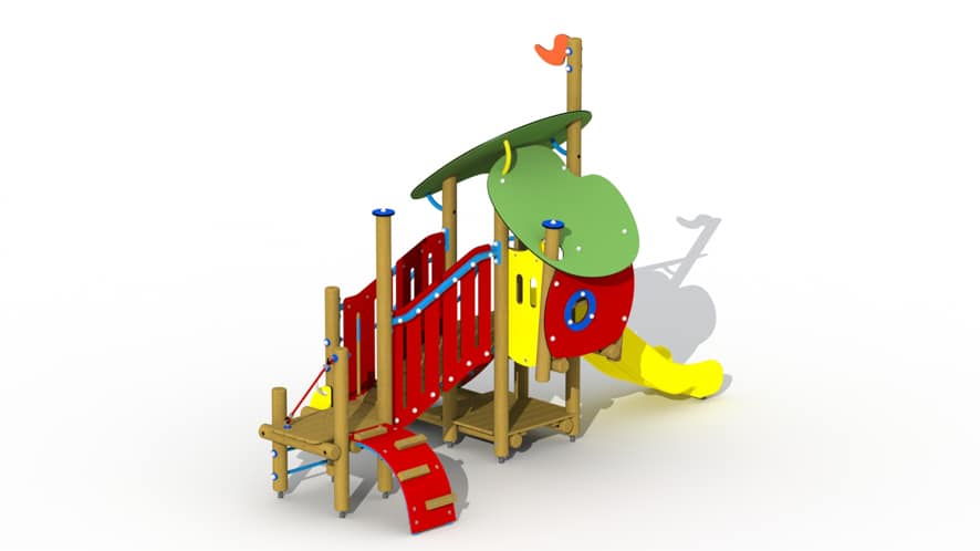 Kleurrijk combinatietoestel voor kinderen van 2 tot 6 jaar. Het speeltoestel bestaat uit een speelhuisje met een platformhoogte van 84cm waarvan een kunststof glijbaan vertrekt. Het speelhuisje kan betreden worden via een gemakkelijke trap met metalen leuningen. Onderaan is een speelvloer voorzien en bovenaan in het huisje is een bankje voorzien, het geheel wordt overdekt door een 2-ledig dak uit afgeronde kleurrijke HDPE polyethyleen panelen. Vanuit het speelhuis kan via een schuine loopbrug met leuning naar een lager gelegen open platform gestapt worden. Het lagergelegen platform kan beklommen worden via een HDPE polyethyleen klimboog met houten klimsteunen en met een ladder met metalen sporten. Op diverse plaatsen in het speeltoestel zijn kunststof handvatten voorzien die het klimmen vergemakkelijken. De rondhouten lariks palen hebben een diameter van 10cm en worden met metalen voetsteunen in of op de grond bevestigd.
