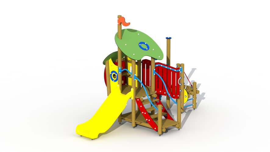 Kleurrijk combinatietoestel voor kinderen van 2 tot 6 jaar. Het speeltoestel bestaat uit een speelhuisje met een platformhoogte van 84cm waarvan een kunststof glijbaan vertrekt. Het speelhuisje kan betreden worden via een gemakkelijke trap met metalen leuningen. Onderaan is een speelvloer voorzien en bovenaan in het huisje is een bankje voorzien, het geheel wordt overdekt door een 2-ledig dak uit afgeronde kleurrijke HDPE polyethyleen panelen. Vanuit het speelhuis kan via een schuine loopbrug met leuning naar een lager gelegen open platform gestapt worden. Het lagergelegen platform kan beklommen worden via een HDPE polyethyleen klimboog met houten klimsteunen en met een ladder met metalen sporten. Op diverse plaatsen in het speeltoestel zijn kunststof handvatten voorzien die het klimmen vergemakkelijken. De rondhouten lariks palen hebben een diameter van 10cm en worden met metalen voetsteunen in of op de grond bevestigd.