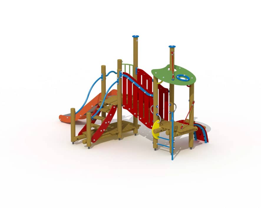 Kleurrijk combinatietoestel voor kinderen van 2 tot 6 jaar. Het speeltoestel bestaat uit 2 speeltorens die onderling verbonden zijn. De eerste speeltoren bestaat uit twee platformen boven elkaar. Vanop het bovenste platform met een hoogte van 84 cm vertrekt een inox glijbaan met HDPE polyethyleen glijbaanboorden. Het speelhuisje kan betreden worden via een gemakkelijke trap met metalen leuningen. Het hoogste platform is voorzien van een balustrade met een kleurrijk metalen hekje. Vanuit de hoogste speeltoren kan via een schuine loopbrug met leuning naar een lager gelegen overdekt platform gestapt worden. Het lager gelegen speelplatform met een hoogte van 52 cm is overdekt door een schuingeplaatst dak uit afgerond kleurrijk HDPE polyethyleen plaatmateriaal. Het toestel is toegankelijk via een ladder met metalen sporten, een mini-glijstang en een HDPE polyethyleen klimbrug met houten klimbalkjes.