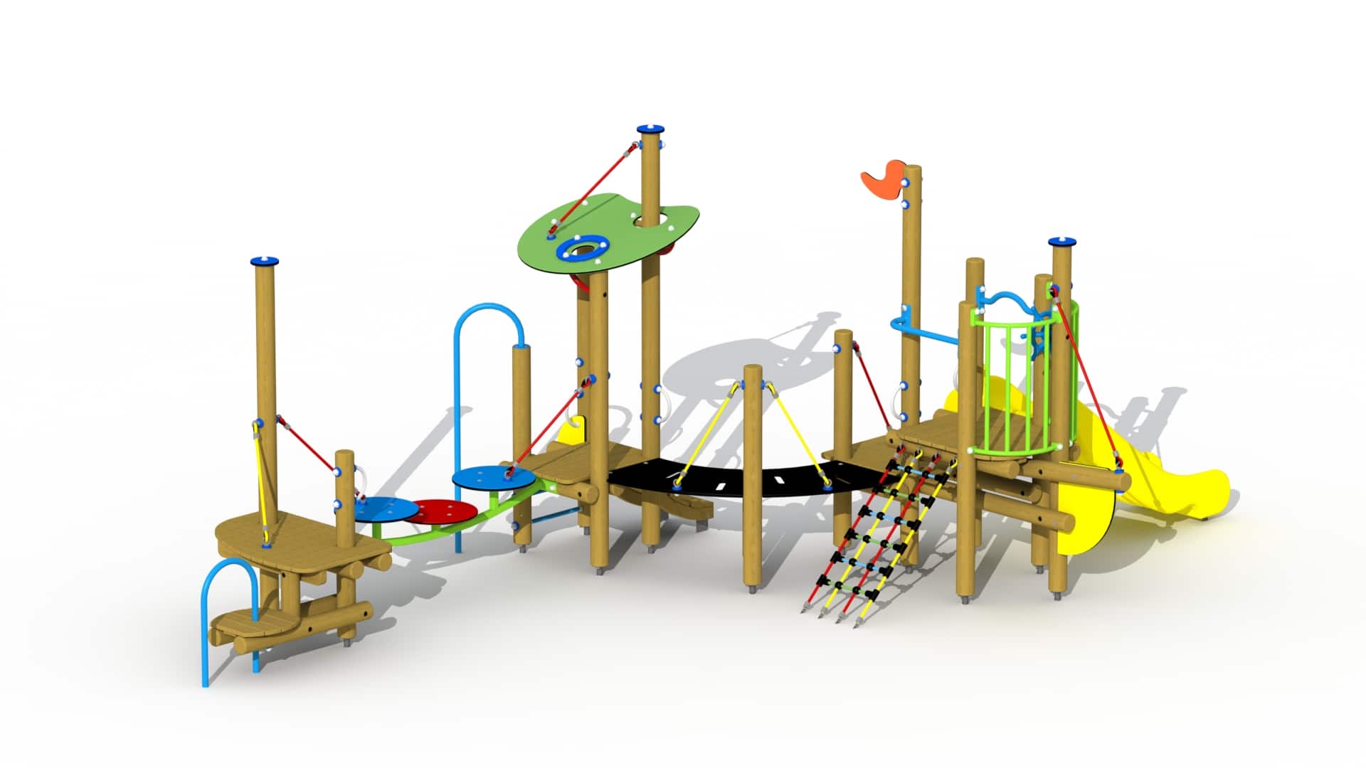 Kleurrijk combinatietoestel voor kinderen van 2 tot 6 jaar. Het speeltoestel bestaat uit diverse platforms op verschillende niveaus die met elkaar verbonden zijn met ludieke verbindingselementen. Van op het hoogste platform met een hoogte van 84cm vertrekt een kunststof glijbaan. Aan het hoogste platform is een balustrade voorzien met kleurrijke metalen hekjes waaraan een kunststof stuur gemonteerd is. Het platform kan bereikt worden via een klauternet en een tweeledige platformtrap met metalen buisleuning. Van op het tussenplatform kan via een kwartcirkelbrug naar een platform met HDPE polyethyleen dak gestapt worden. Het overdekte platform is voorzien van een ladder met metalen sporten, een klimboog en een mini-glijstang. Van op dit platform kan verder gebalanceerd worden over een paddenstoelenbrug met HDPE polyethyleen schijven naar een kleiner platform.