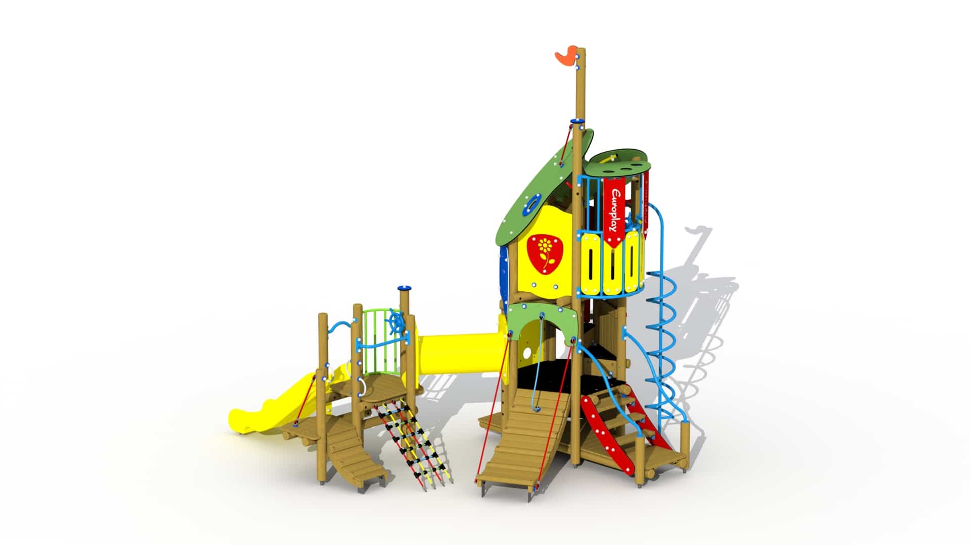 Kleurrijk combinatietoestel voor kinderen van 2 tot 6 jaar. Het speeltoestel bestaat uit een hoge speeltoren verbonden aan een lager gelegen overdekt speelhuis. De speeltoren bestaat uit drie platforms boven elkaar. Helemaal onderaan bevindt zich een speelvloer waar de kinderen zich kunnen verschuilen. Aan het laagste platform is een telraam met HDPE polyethyleen schijven voorzien. Het hoger gelegen platform kan bereikt worden via een gemakkelijke trap met metalen leuningen, een klimboog en een HDPE polyethyleen rotswand met kunststof klimgrepen. Het hoogste platform bevindt zich op 1,91 m en kan beklommen worden via een ingewerkte wenteltrap. Dit platform is voorzien van een gebogen metalen balustrade met kunststof stuur. Van op dit platform kan naar beneden gegleden worden via een metalen spiraal glijstang. Het geheel wordt overdekt door een 2-ledig dak uit afgeronde kleurrijke HDPE polyethyleen panelen.