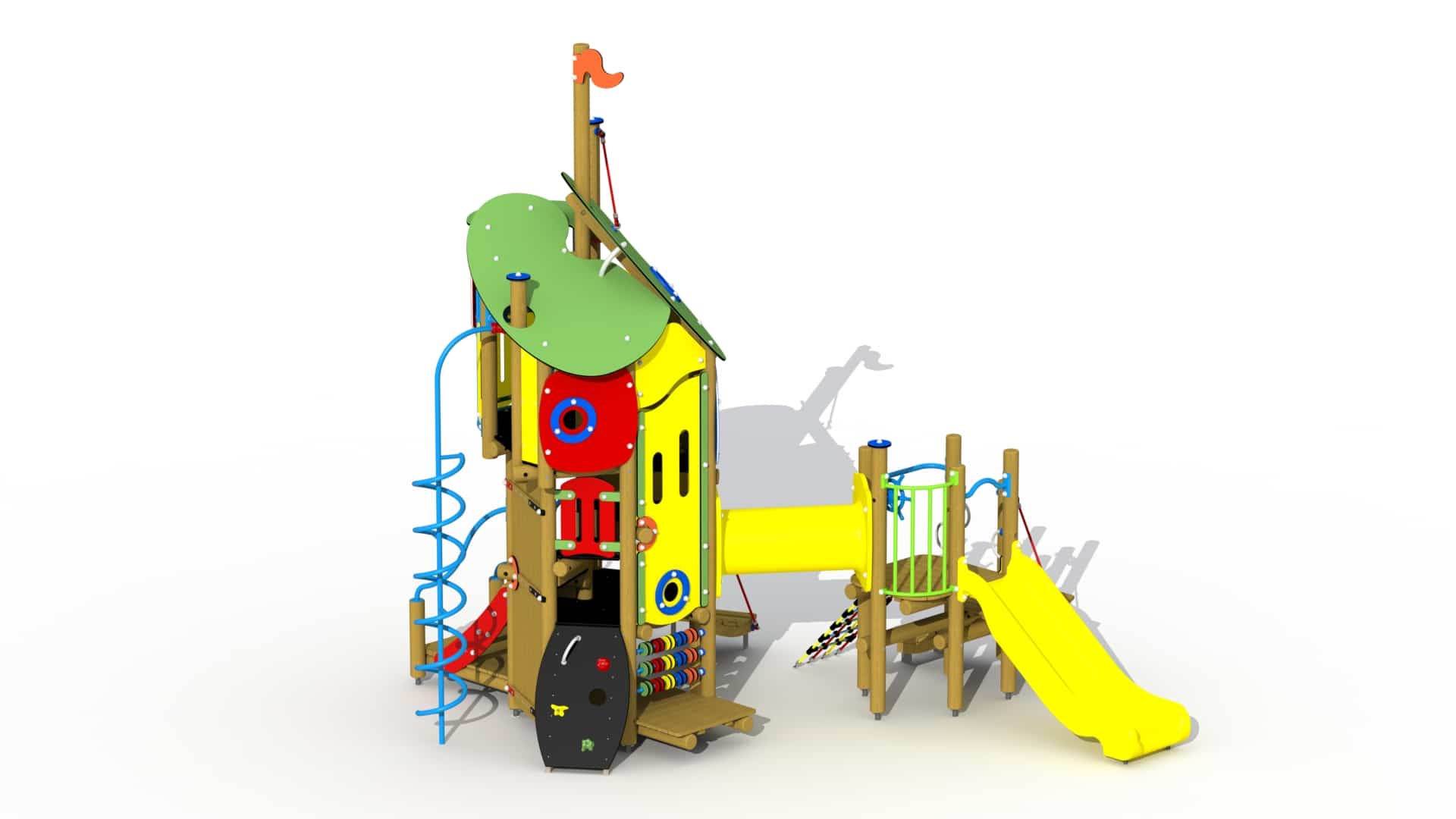 Kleurrijk combinatietoestel voor kinderen van 2 tot 6 jaar. Het speeltoestel bestaat uit een hoge speeltoren verbonden aan een lager gelegen overdekt speelhuis. De speeltoren bestaat uit drie platforms boven elkaar. Helemaal onderaan bevindt zich een speelvloer waar de kinderen zich kunnen verschuilen. Aan het laagste platform is een telraam met HDPE polyethyleen schijven voorzien. Het hoger gelegen platform kan bereikt worden via een gemakkelijke trap met metalen leuningen, een klimboog en een HDPE polyethyleen rotswand met kunststof klimgrepen. Het hoogste platform bevindt zich op 1,91 m en kan beklommen worden via een ingewerkte wenteltrap. Dit platform is voorzien van een gebogen metalen balustrade met kunststof stuur. Van op dit platform kan naar beneden gegleden worden via een metalen spiraal glijstang. Het geheel wordt overdekt door een 2-ledig dak uit afgeronde kleurrijke HDPE polyethyleen panelen.