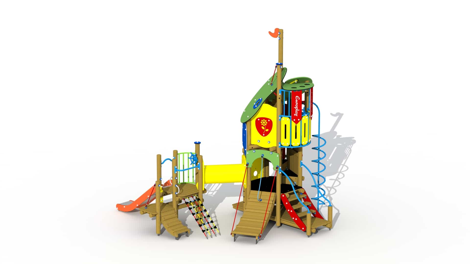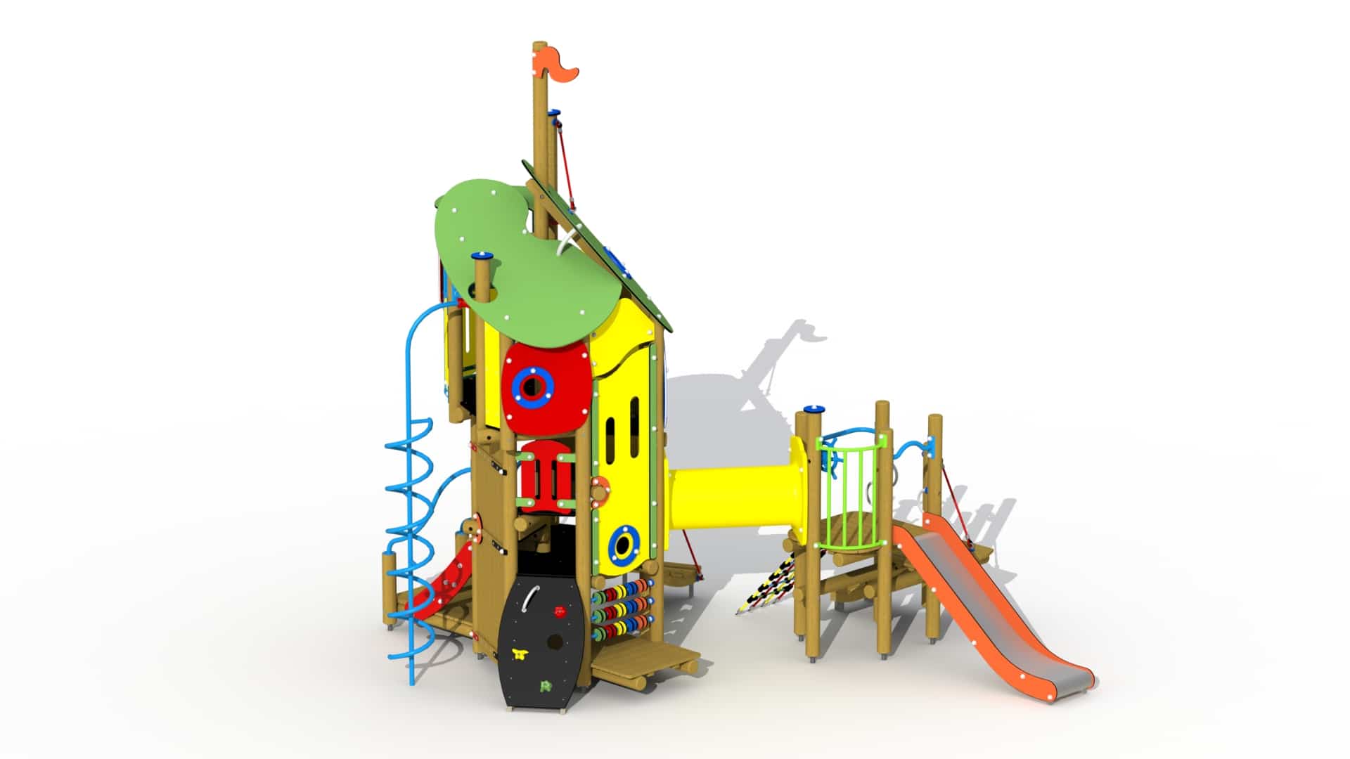 Kleurrijk combinatietoestel voor kinderen van 2 tot 6 jaar. Het speeltoestel bestaat uit een hoge speeltoren verbonden aan een lager gelegen overdekt speelhuis. De speeltoren bestaat uit drie platforms boven elkaar. Helemaal onderaan bevindt zich een speelvloer waar de kinderen zich kunnen verschuilen. Aan het laagste platform is een telraam met HDPE polyethyleen schijven voorzien. Het hoger gelegen platform kan bereikt worden via een gemakkelijke trap met metalen leuningen, een klimboog en een HDPE polyethyleen rotswand met kunststof klimgrepen. Het hoogste platform bevindt zich op 1,91 m en kan beklommen worden via een ingewerkte wenteltrap. Dit platform is voorzien van een gebogen metalen balustrade met kunststof stuur. Van op dit platform kan naar beneden gegleden worden via een metalen spiraal glijstang. Het geheel wordt overdekt door een 2-ledig dak uit afgeronde kleurrijke HDPE polyethyleen panelen.
