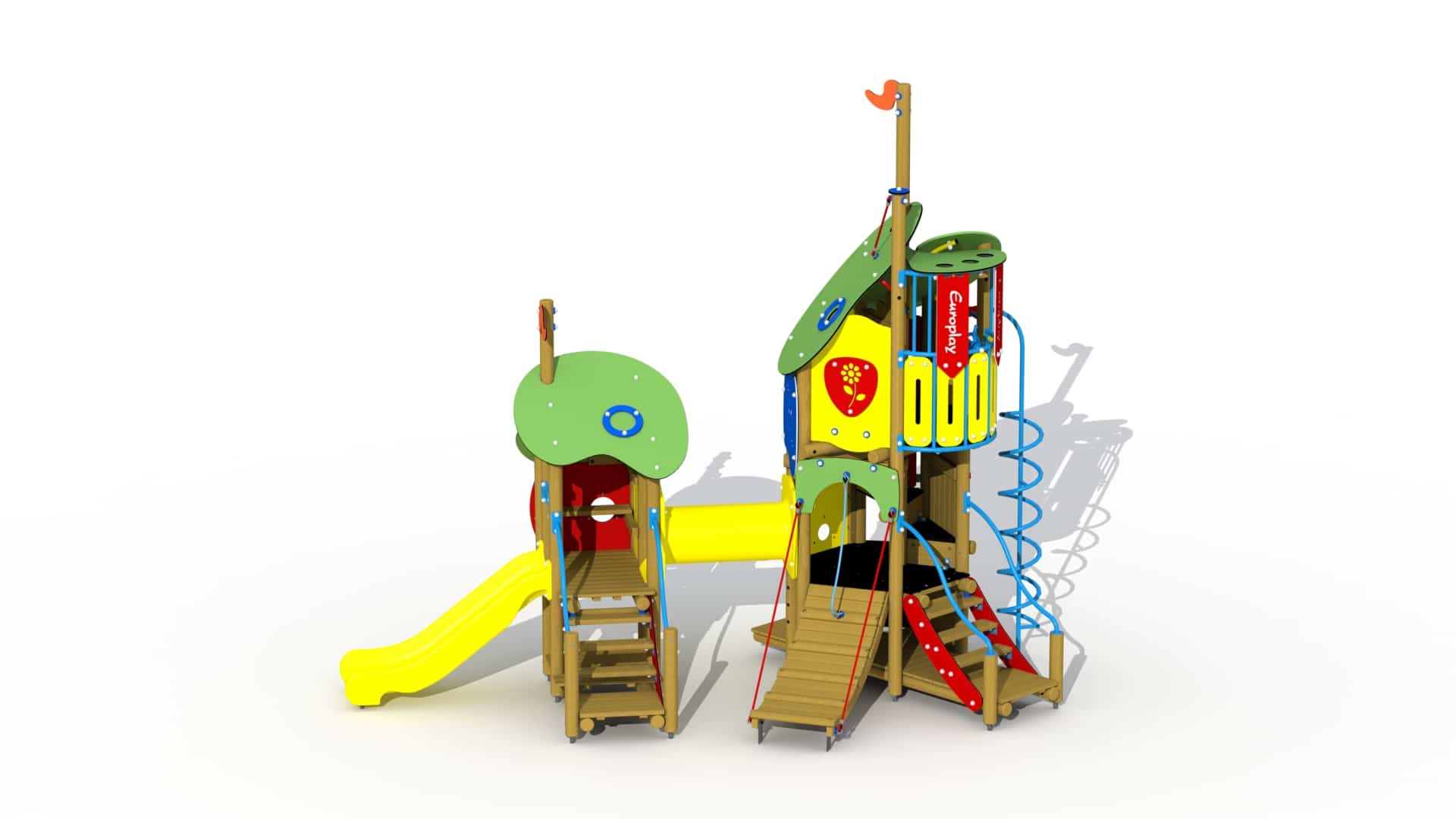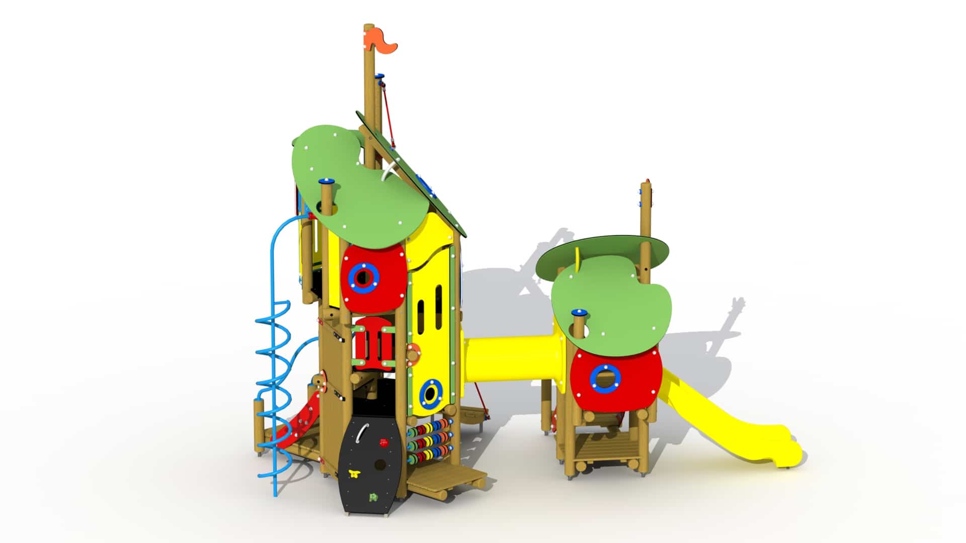 Kleurrijk combinatietoestel voor kinderen van 3 tot 6 jaar. Het speeltoestel bestaat uit een hoge speeltoren verbonden aan een lager gelegen overdekt speelhuis. De speeltoren bestaat uit drie platforms boven elkaar. Helemaal onderaan bevindt zich een speelvloer waar de kinderen zich kunnen verschuilen. Aan het laagste platform is een telraam met HDPE polyethyleen schijven voorzien. Het hoger gelegen platform kan bereikt worden via een gemakkelijke trap met metalen leuningen, een klimboog en een HDPE polyethyleen rotswand met kunststof klimgrepen. Het hoogste platform bevindt zich op 1,91m en kan beklommen worden via een ingewerkte wenteltrap. Dit platform is voorzien van een gebogen metalen balustrade met kunststof stuur. Van op dit platform kan naar beneden gegleden worden via een metalen spiraal glijstang. Het geheel wordt overdekt door een 2-ledig dak uit afgeronde kleurrijke HDPE polyethyleen panelen.
