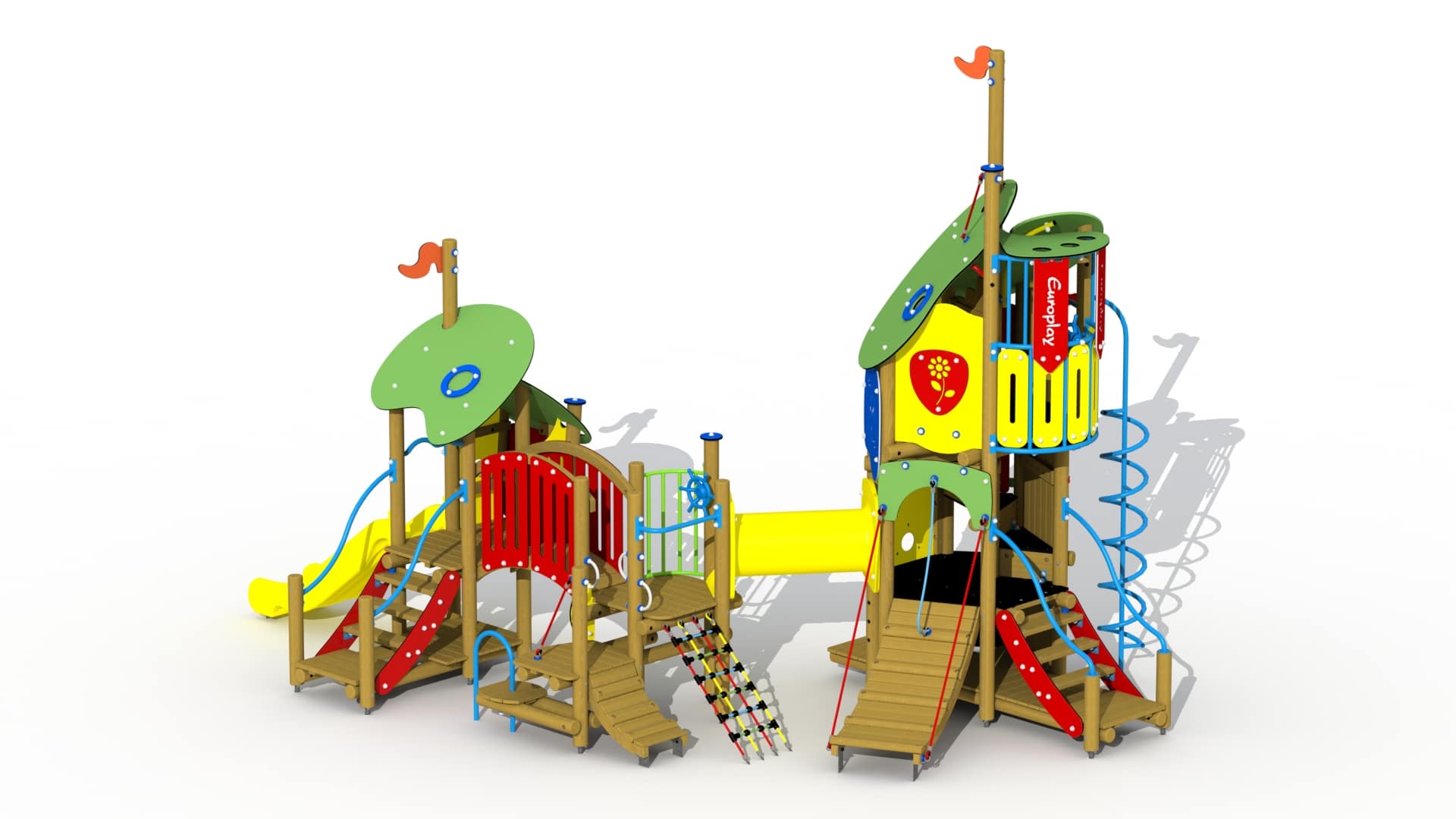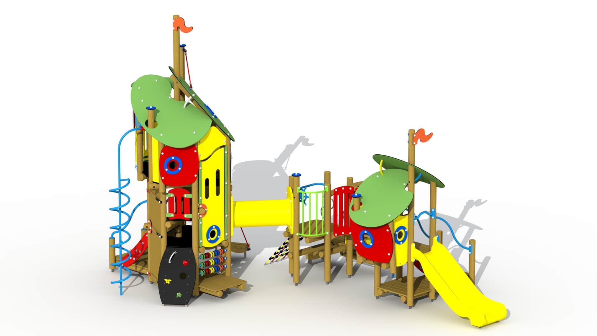 Kleurrijk combinatietoestel voor kinderen van 3 tot 6 jaar. Het speeltoestel bestaat uit een hoge speeltoren verbonden met een overdekt en een open speelplatform. De speeltoren bestaat uit drie platformen boven elkaar. Aan het laagste platform is een telraam met HDPE polyethyleen schijven voorzien. Het hoger gelegen platform kan bereikt worden via een gemakkelijke trap met metalen leuningen, een klimboog en een HDPE polyethyleen rotswand met kunststof klimgrepen. Het hoogste platform bevindt zich op 1,91m en kan beklommen worden via een ingewerkte wenteltrap. Dit platform is voorzien van een gebogen metalen balustrade met kunststof stuur. Van op dit platform kan naar beneden gegleden worden via een metalen spiraal glijstang. Het geheel wordt overdekt door een 2-ledig dak uit afgeronde kleurrijke HDPE polyethyleen panelen. Vanuit de hoge speeltoren kan via een dubbelwandige HDPE polyethyleen doorkruipbuis naar een open platform gekropen worden.
