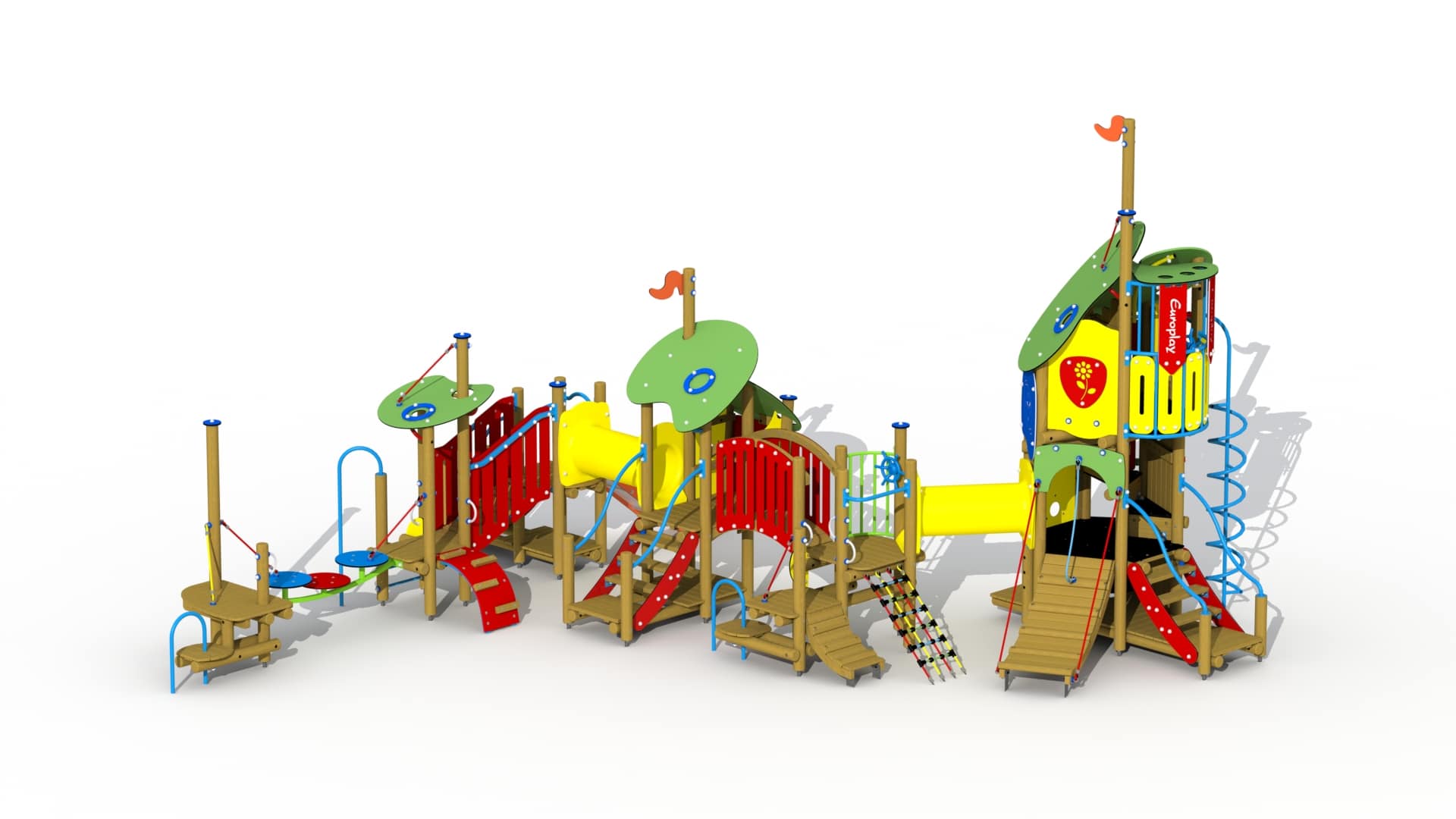 Kleurrijk combinatietoestel voor kinderen van 2 tot 6 jaar. Het speeltoestel bestaat uit een hoge speeltoren verbonden met 2 gesloten en 3 open speelplatforms. De speeltoren bestaat uit drie platforms boven elkaar. Het hoger gelegen platform kan bereikt worden via een gemakkelijke trap met metalen leuningen, een klimboog en een HDPE polyethyleen rotswand met kunststof klimgrepen. Het hoogste platform kan beklommen worden via een ingewerkte wenteltrap en is voorzien van een gebogen metalen balustrade met kunststof stuur. Van op dit platform kan naar beneden gegleden worden via een metalen spiraal glijstang. Het geheel wordt overdekt door een 2-ledig dak uit afgeronde kleurrijke HDPE polyethyleen panelen. Vanuit de hoge speeltoren kan via een dubbelwandige HDPE polyethyleen doorkruipbuis naar een open platform gekropen worden. Dit platform kan bereikt worden via een klauternet en een tweeledige platformtrap met metalen buisleuning en een houten klimboog.