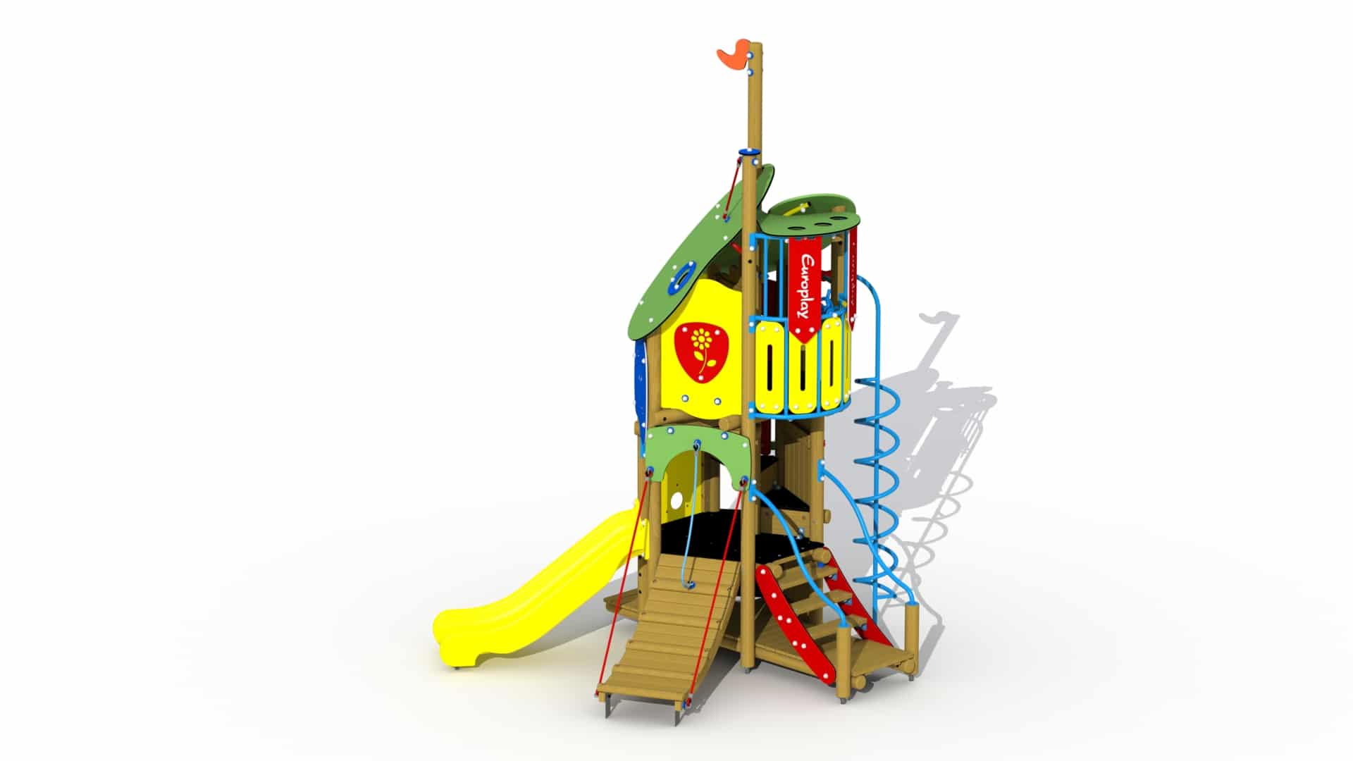 Kleurrijke speeltoren voor kinderen van 2 tot 6 jaar. Het speeltoestel bestaat uit drie platforms boven elkaar. Helemaal onderaan bevindt zich een speelvloer waar de kinderen zich kunnen verschuilen. Aan het laagste platform is een telraam met HDPE polyethyleen schijven voorzien. Het hoger gelegen platform kan bereikt worden via een gemakkelijke trap met metalen leuningen, een klimboog en een HDPE polyethyleen rotswand met kunststof klimgrepen. Het platform bevindt zich op 84 cm en kan verlaten worden via een inox glijbaan met HDPE polyethyleen glijbaanboorden. Het hoogste platform bevindt zich op 1,91 m en kan beklommen worden via een ingewerkte wenteltrap. Het bovenste platform is voorzien van een gebogen metalen balustrade met kunststof stuur. Van op het bovenste platform kan naar beneden gegleden worden via een metalen spiraalglijstang.