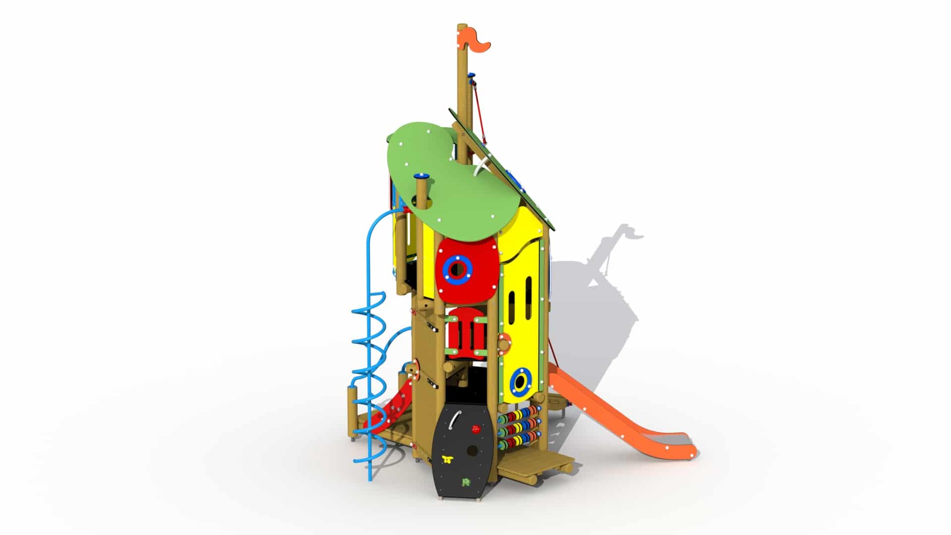 Kleurrijke speeltoren voor kinderen van 2 tot 6 jaar. Het speeltoestel bestaat uit drie platforms boven elkaar. Helemaal onderaan bevindt zich een speelvloer waar de kinderen zich kunnen verschuilen. Aan het laagste platform is een telraam met HDPE polyethyleen schijven voorzien. Het hoger gelegen platform kan bereikt worden via een gemakkelijke trap met metalen leuningen, een klimboog en een HDPE polyethyleen rotswand met kunststof klimgrepen. Het platform bevindt zich op 84 cm en kan verlaten worden via een inox glijbaan met HDPE polyethyleen glijbaanboorden. Het hoogste platform bevindt zich op 1,91 m en kan beklommen worden via een ingewerkte wenteltrap. Het bovenste platform is voorzien van een gebogen metalen balustrade met kunststof stuur. Van op het bovenste platform kan naar beneden gegleden worden via een metalen spiraalglijstang.