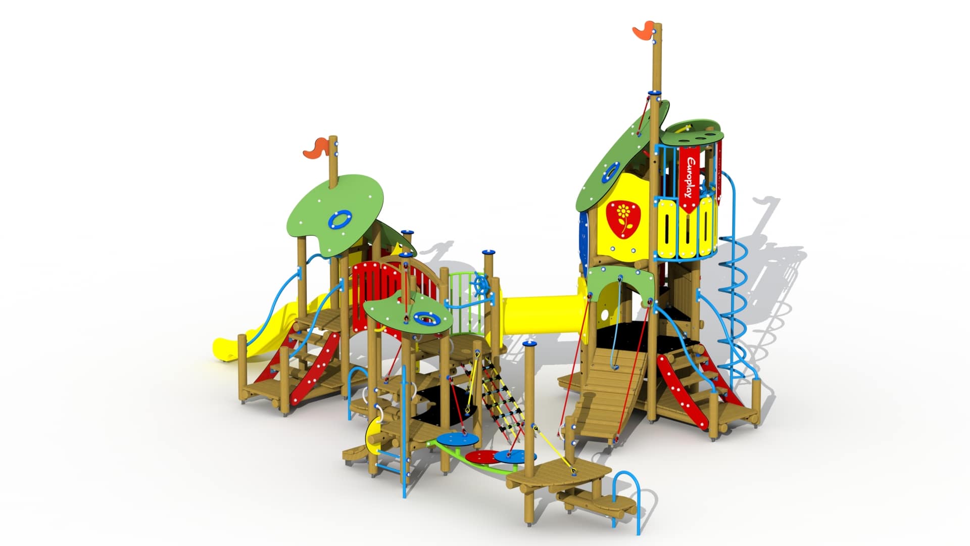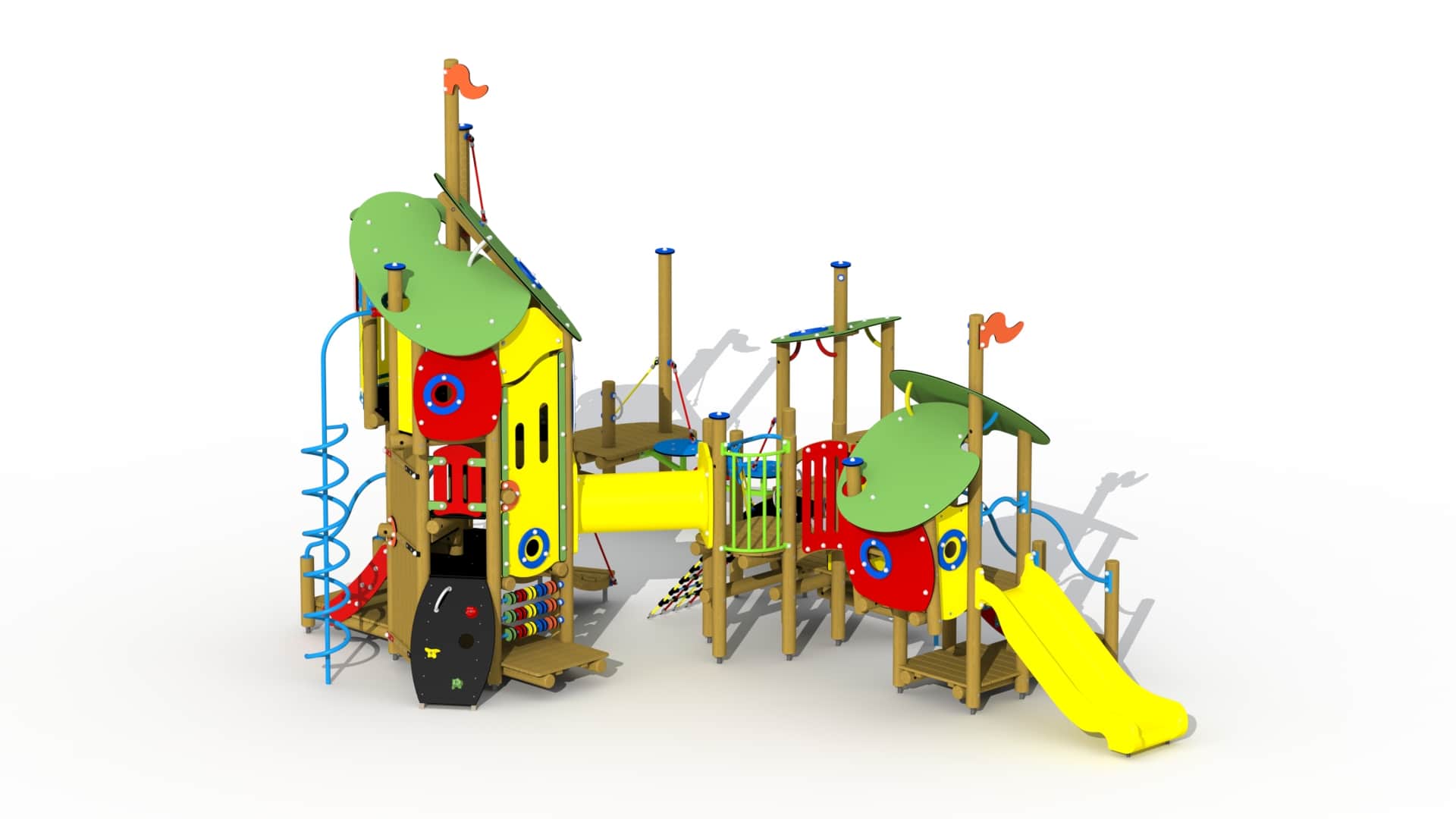 Kleurrijk combinatietoestel voor kinderen van 2 tot 6 jaar. Het speeltoestel bestaat uit een hoge speeltoren verbonden met 2 overdekte en 2 open speelplatforms. De speeltoren bestaat uit drie platforms boven elkaar. Het hoger gelegen platform kan bereikt worden via een gemakkelijke trap met metalen leuningen, een klimboog en een HDPE polyethyleen rotswand met kunststof klimgrepen. Het hoogste platform kan beklommen worden via een ingewerkte wenteltrap. Dit platform is voorzien van een gebogen metalen balustrade met kunststof stuur. Van op dit platform kan naar beneden gegleden worden via een metalen spiraalglijstang. Het geheel wordt overdekt door een 2-ledig dak uit afgeronde kleurrijke HDPE polyethyleen panelen. Vanuit de hoge speeltoren kan via dubbelwandige HDPE polyethyleen doorkruipbuis naar een open platform gekropen worden. Het open tussenplatform kan bereikt worden via een klauternet en een tweeledige platformtrap met metalen buisleuning.