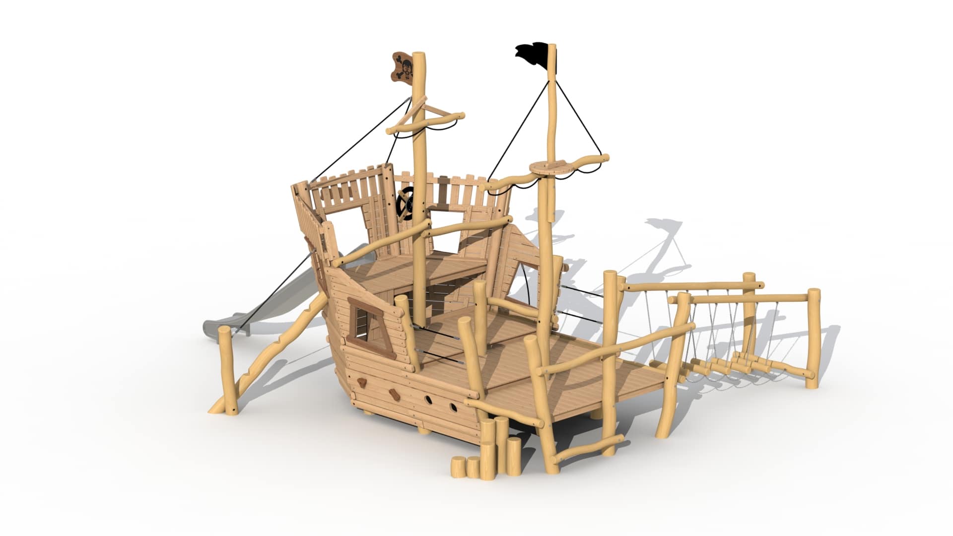 Een speeltoestel in de vorm van een piratenschip voor kinderen van 4 tot 12 jaar. De Albatros (het achtersteven) is opgebouwd uit een stuurwiel uit HDPE polyethyleen, een klimmast met piratenvlag, een inox glijbaan, een klimnet, een scheepsruim met doorklimgaten, klimbomen, klimgrepen en een wiebelbrug. Het net en de touwen zijn opgebouwd uit staalkabel. De rondhouten robinia palen hebben een diameter van 16 tot 18 cm en worden rechtstreeks met beton in de grond bevestigd. Alle metaalonderdelen zijn roestvrij voorbehandeld en alle moeren en bouten zijn volledig afgeschermd met kunststof afdekdoppen.