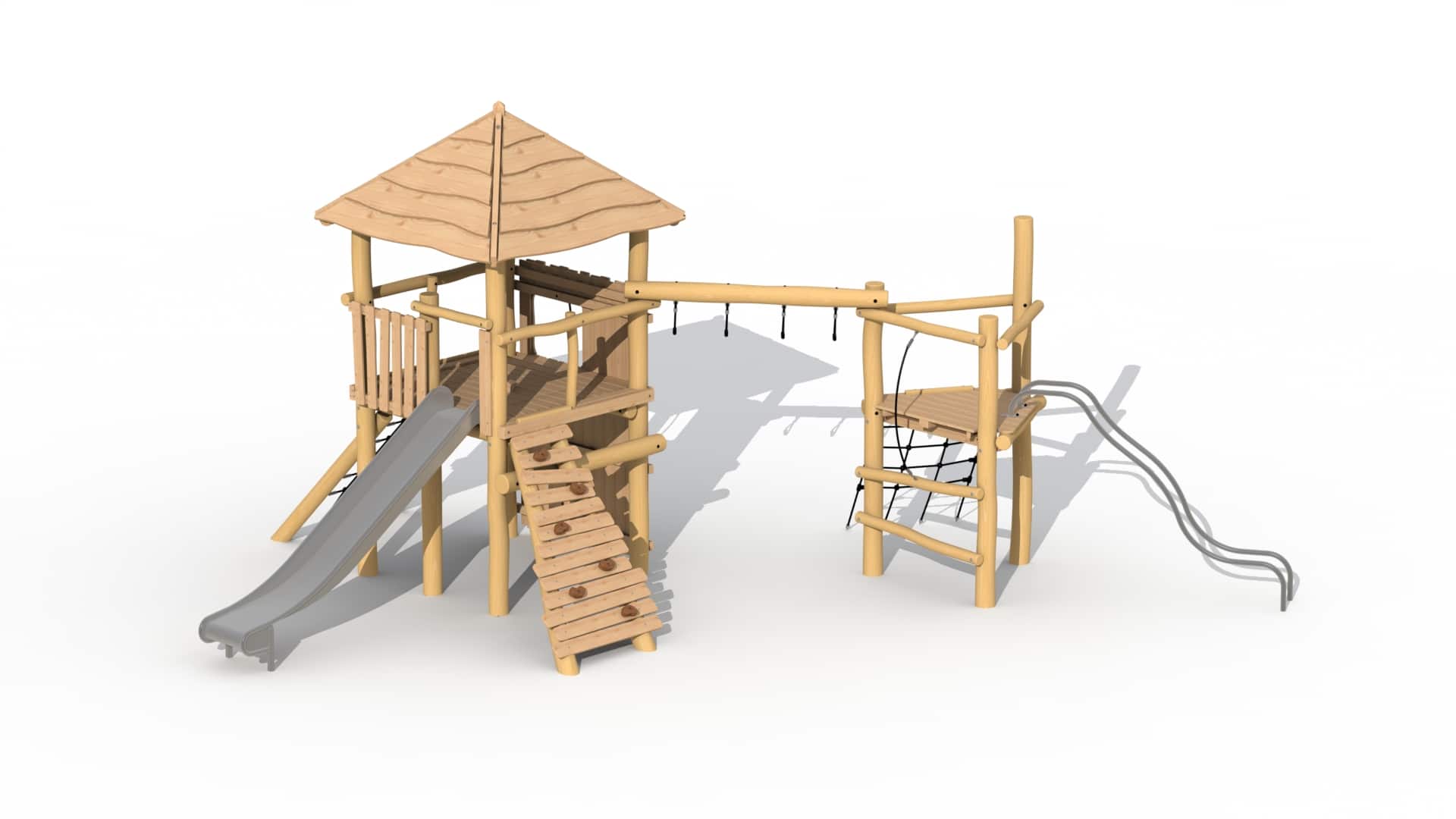 Combinatie van de tovertoren met dak en speeltoren voor kinderen van 4 tot 12 jaar, met hanglussen. De vloer- en dakplanken, klimmuur en zijwanden zijn vervaardigd uit lariks hout, de rest van het speeltoestel uit robinia hout. De combi-tovertoren kan bereikt worden langs de tovertoren via een klimmuur met klimgrepen uit padouk, een klimnet met touwen in staalkabel en een klimconstructie alsook langs de speeltoren via een klimnet of een klimtouw, bestaande uit rondhouten robinia palen. De combi-tovertoren kan verlaten worden via een glijbaan uit roestvrij staal of via inox glijbuizen. Alle moeren en bouten zijn volledig afgeschermd. De gehele constructie wordt rechtstreeks met beton in de grond verankerd.