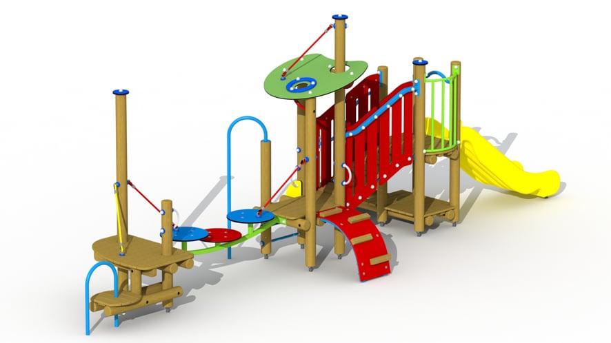 Kleurrijk combinatietoestel voor kinderen van 2 tot 6 jaar. Het speeltoestel bestaat uit 3 speeltorens die onderling verbonden zijn. De eerste speeltoren bestaat uit twee platformen boven elkaar. Vanop het bovenste platform met een hoogte van 84 cm vertrekt een inox glijbaan met HDPE polyethyleen glijbaanboorden. Het speelhuisje kan betreden worden via een gemakkelijke trap met metalen leuningen. Het hoogste platform is voorzien van een balustrade met een kleurrijk metalen hekje. Vanuit de hoogste speeltoren kan via een schuine loopbrug met leuning naar een lager gelegen overdekt platform gestapt worden. Het lagergelegen speelplatform met een hoogte van 52 cm is overdekt door een schuingeplaatst dak uit afgerond kleurrijk HDPE polyethyleen plaatmateriaal. Het toestel is toegankelijk via een ladder met metalen sporten, een glijstang en een HDPE polyethyleen klimbrug met houten klimbalkjes.