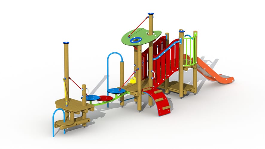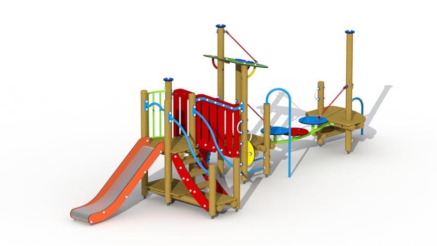 Kleurrijk combinatietoestel voor kinderen van 2 tot 6 jaar. Het speeltoestel bestaat uit 3 speeltorens die onderling verbonden zijn. De eerste speeltoren bestaat uit twee platformen boven elkaar. Vanop het bovenste platform met een hoogte van 84 cm vertrekt een inox glijbaan met HDPE polyethyleen glijbaanboorden. Het speelhuisje kan betreden worden via een gemakkelijke trap met metalen leuningen. Het hoogste platform is voorzien van een balustrade met een kleurrijk metalen hekje. Vanuit de hoogste speeltoren kan via een schuine loopbrug met leuning naar een lager gelegen overdekt platform gestapt worden. Het lagergelegen speelplatform met een hoogte van 52 cm is overdekt door een schuingeplaatst dak uit afgerond kleurrijk HDPE polyethyleen plaatmateriaal. Het toestel is toegankelijk via een ladder met metalen sporten, een glijstang en een HDPE polyethyleen klimbrug met houten klimbalkjes.