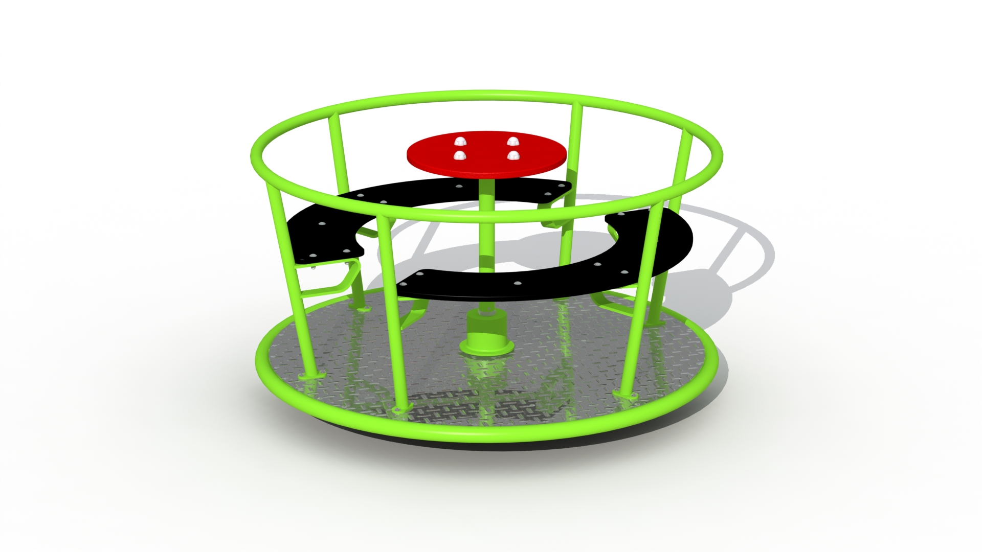 Draaimolen voor kinderen van 3 tot 10 jaar. De kleurrijke draaimole n is opgebouwd uit polyestergecoate metalen buizen met een diameter van 33mm. De draaimolen is voorzien van twee halfronde bankjes uit 19mm HDPE polyethyleen die op drie punten met een metalen steunbeugel ondersteund worden. De metalen vloerplaat is overdekt met een traanplaat. Het centrale draaistuur laat de kinderen toe de snelheid van draaien zelf te bepalen. De draaimolen draait op een onderhoudsvrij draaimechanisme met dubbele kogellagers (onder en boven). Alle metaalonderdelen zijn roestvrij voorbehandeld en alle moeren en bouten zijn volledig afgeschermd met kunststof bloemvormige afdekdoppen.