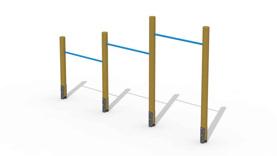 Houten duikelrek met 3 rekstokken voor kinderen vanaf 6 jaar. Er kan aan de rekstok gehangen worden en men kan er ook omheen draaien. De rekstokken komen op een hoogte van respectievelijk 1,06 m, 1,45 m en 1,85 m. Er is een extra voorziening aanwezig tegen het verdraaien van de buis. De rondhouten lariks palen hebben een diameter van 12 cm en worden met metalen voetsteunen in de grond bevestigd. Alle metaalonderdelen zijn roestvrij voorbehandeld en alle moeren en bouten worden volledig afgeschermd met kunststof afdekdoppen.