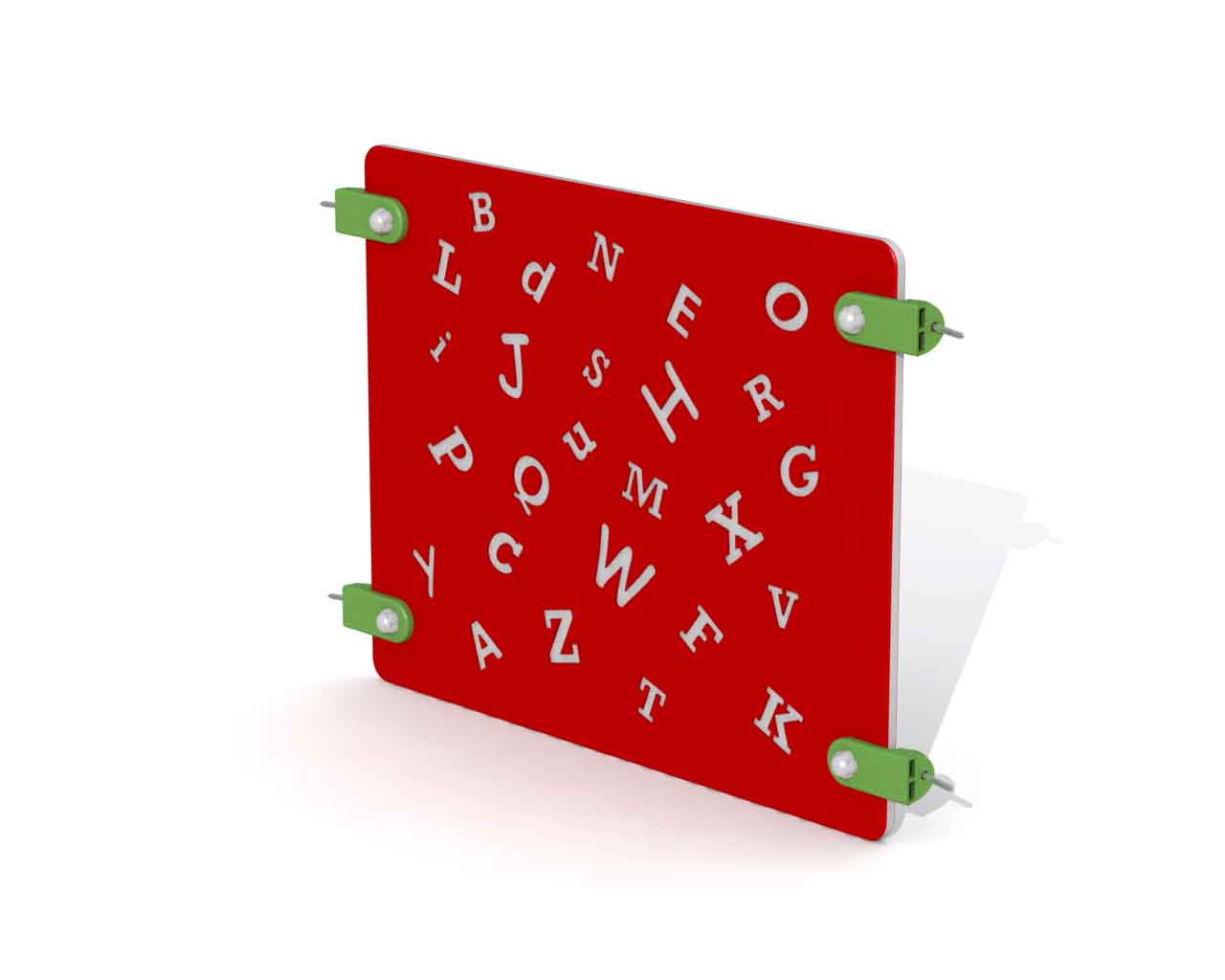 Spelpaneel voor kinderen vanaf 2 jaar. Het spelpaneel wordt vervaardigd uit HDPE polyethyleen en heeft 2 verschillende zijden: het alfabet en rekensommen. In combinatie met 2 rondhouten palen (ref. S032) kan het spelpaneel vrijstaand geplaatst worden. Alle moeren en bouten worden afgeschermd met witte bloemvormige afdekdoppen.Bij de meeste structuren kan één of meerdere spelpanelen in de speelhuisjes ingebouwd worden, ter vervanging van een gele wand.