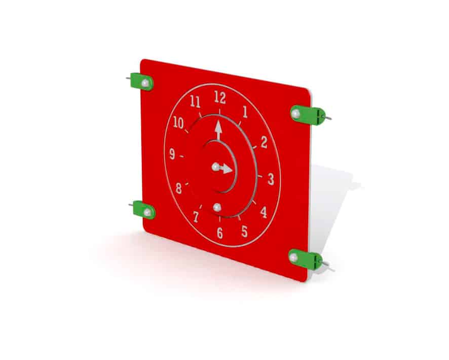 Spelpaneel in de vorm van een klok voor kinderen vanaf 2 jaar. Het spelpaneel wordt vervaardigd uit HDPE polyethyleen. In combinatie met 2 rondhouten palen (ref. S032) kan het spelpaneel vrijstaand geplaatst worden. Alle moeren en bouten worden afgeschermd met witte bloemvormige afdekdoppen.