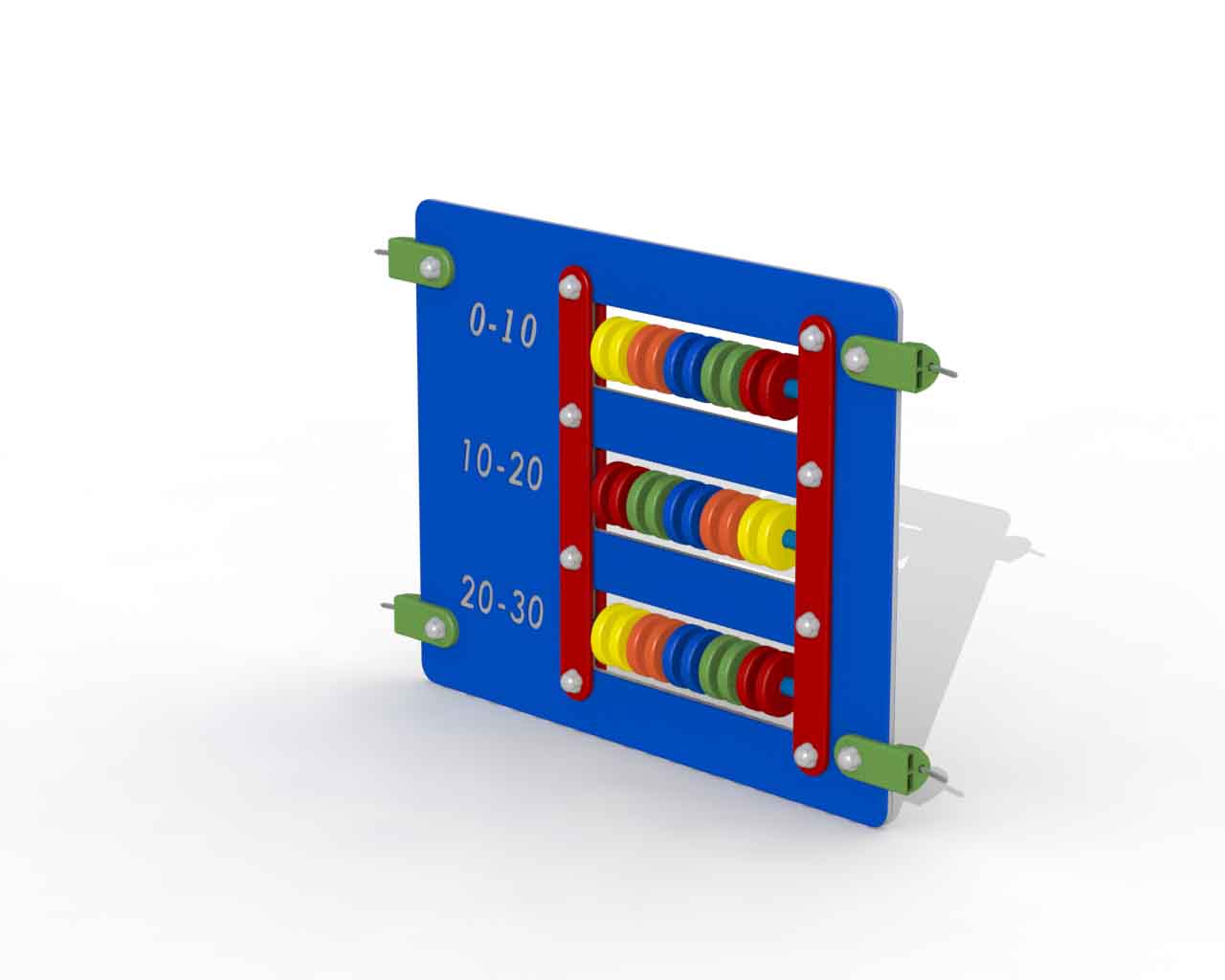 Spelpaneel in de vorm van een rekenbord voor kinderen vanaf 2 jaar. Het spelpaneel en de telschijfjes worden vervaardigd uit HDPE polyethyleen. In combinatie met 2 rondhouten palen (ref. S032) kan het spelpaneel vrijstaand geplaatst worden. Alle moeren en bouten worden afgeschermd met witte bloemvormige afdekdoppen.De educatieve spelpanelen worden geleverd met 4 bevestigingen. De (eventuele) bijhorende palen dienen apart besteld te worden.Bij de meeste structuren kan één of meerdere spelpanelen in de speelhuisjes ingebouwd worden, ter vervanging van een gele wand.