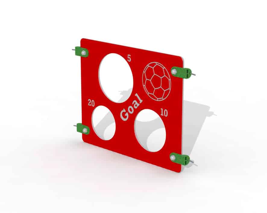 Spelpaneel in de vorm van een scorebord voor kinderen vanaf 2 jaar. Het spelpaneel wordt vervaardigd uit HDPE polyethyleen en heeft 3 gaten die dienst doen als goal. In combinatie met 2 rondhouten palen (ref. S032) kan het spelpaneel vrijstaand geplaatst worden. Alle moeren en bouten worden afgeschermd met witte bloemvormige afdekdoppen.
