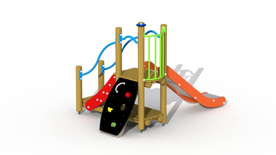 Kleurrijk speeltoestel voor kinderen van 2 tot 6 jaar. De speeltoren bestaat uit twee platformen boven elkaar. Vanop het bovenste platform met een hoogte van 84 cm vertrekt een inox glijbaan met HDPE polyethyleen glijbaanboorden. Het speelhuisje kan betreden worden via een gemakkelijke trap met metalen leuningen en een HDPE polyethyleen rotswand met kunststof klimgrepen. Het hoogste platform is voorzien van een balustrade met een kleurrijk metalen hekje. De rondhouten lariks palen hebben een diameter van 10 cm en worden met metalen voetsteunen in of op de grond bevestigd.