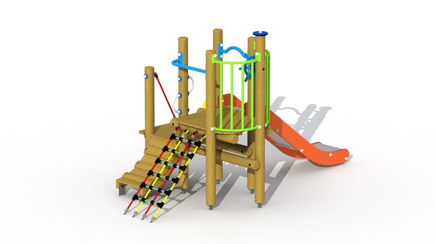 Kleurrijk speeltoestel voor kinderen van 2 tot 6 jaar. Het speeltoestel bestaat uit diverse platforms op verschillende niveaus die met elkaar verbonden zijn. Van op het hoogste platform met een hoogte van 84 cm vertrekt een inox glijbaan met HDPE polyethyleen glijbaanboorden. Aan het hoogste platform is een balustrade voorzien met kleurrijke metalen hekjes waaraan een kunststof stuur om aan te draaien gemonteerd is. Het platform kan bereikt worden via een klauternet, een tweeledige platformtrap met metalen buisleuning en een houten klimboog. De rondhouten lariks palen hebben een diameter van 10 cm en worden met metalen voetsteunen in of op de grond bevestigd.