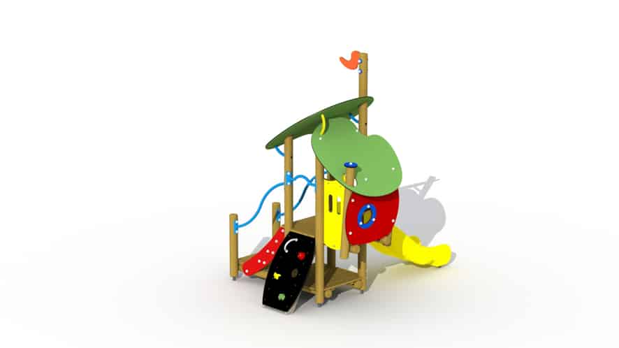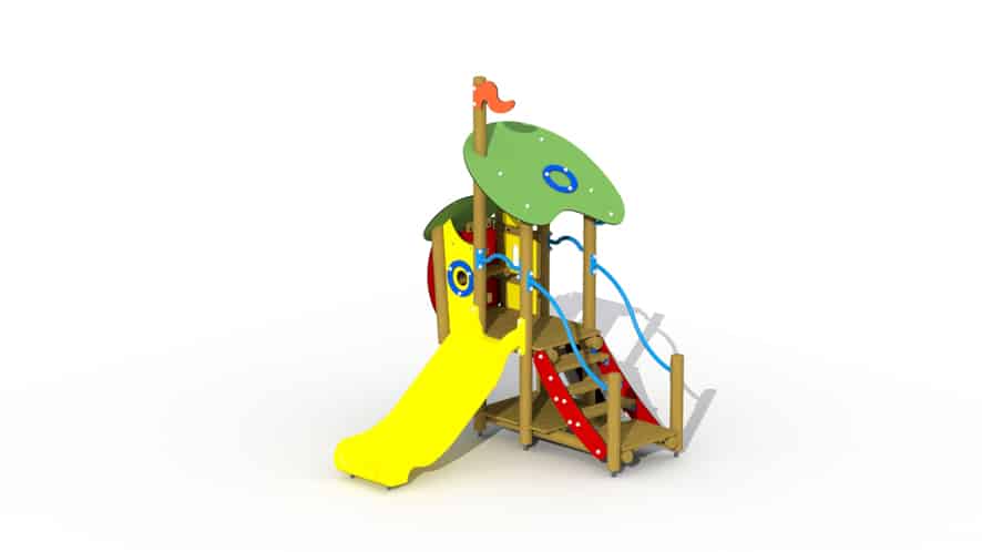Kleurrijk speeltoestel voor kinderen van 2 tot 6 jaar. Het speeltoestel bestaat uit een speelhuisje met een platformhoogte van 84 cm waarvan een kunststof glijbaan vertrekt. Het speelhuisje kan betreden worden via een gemakkelijke trap met metalen leuningen alsook via een antislip rotswand. Onderaan is een speelvloer voorzien, en bovenaan in het huisje is een bankje voorzien. Het geheel wordt overdekt door een 2-ledig dak uit afgeronde kleurrijke HDPE polyethyleen panelen. De rondhouten lariks palen hebben een diameter van 10 cm en worden met metalen voetsteunen in of op de grond bevestigd.