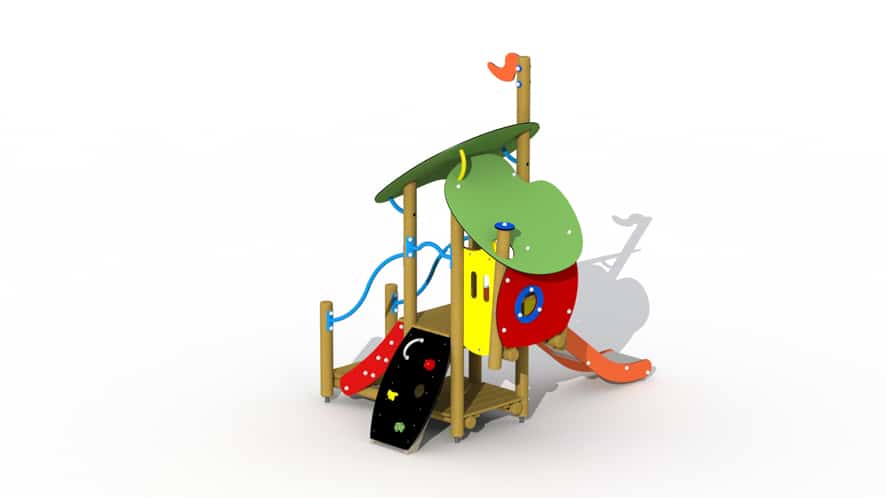 Kleurrijk speeltoestel voor kinderen van 2 tot 6 jaar. Het speeltoestel bestaat uit een speelhuisje met een platformhoogte van 84 cm waarvan een inox glijbaan met HDPE polyethyleen glijbaanboorden vertrekt. Het speelhuisje kan betreden worden via een gemakkelijke trap met metalen leuningen alsook via een antislip rotswand. Onderaan is een speelvloer voorzien, en bovenaan in het huisje is een bankje voorzien. Het geheel wordt overdekt door een 2-ledig dak uit afgeronde kleurrijke HDPE polyethyleen panelen. De rondhouten lariks palen hebben een diameter van 10 cm en worden met metalen voetsteunen in of op de grond bevestigd.