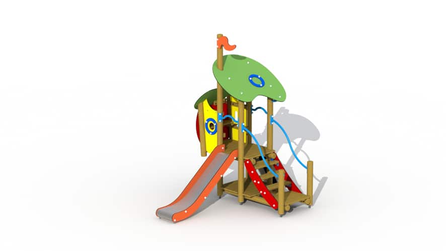 Kleurrijk speeltoestel voor kinderen van 2 tot 6 jaar. Het speeltoestel bestaat uit een speelhuisje met een platformhoogte van 84 cm waarvan een inox glijbaan met HDPE polyethyleen glijbaanboorden vertrekt. Het speelhuisje kan betreden worden via een gemakkelijke trap met metalen leuningen alsook via een antislip rotswand. Onderaan is een speelvloer voorzien, en bovenaan in het huisje is een bankje voorzien. Het geheel wordt overdekt door een 2-ledig dak uit afgeronde kleurrijke HDPE polyethyleen panelen. De rondhouten lariks palen hebben een diameter van 10 cm en worden met metalen voetsteunen in of op de grond bevestigd.