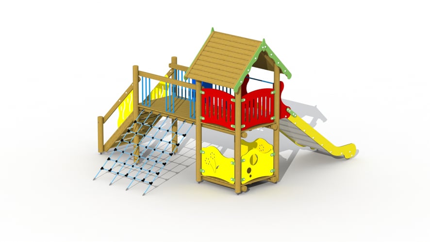 Een toestel met een langwerpig platform dat gedeeltelijk met een zadeldak bedekt is, geschikt voor kinderen van 3 tot 12 jaar. Het platform kan bereikt worden langs een schuingeplaatst klimnet of langs een gemakkelijke trap. Bovenaan kan het platform verlaten worden via een inox glijbaan van 1 meter breed en onderaan zit een speelhuisje ingewerkt met vloer dat eventueel supplementair kan uitgerust worden met twee zitbankjes en een tafeltje (S001) of een toogje met telraam (S003). Daarnaast zijn ook nog volgende aanbouwelementen mogelijk: klimboog (S006), rotswand (S007), lage glijstang (S008), zandwerkplaats (S009), aanbouwnet (S013), lage spiraalglijstang (S014) en/of spelpanelen (S033-S038). De rondhouten palen worden met metalen voetsteunen in of op de grond geplaatst. Alle metalen onderdelen zijn roestvrij voorbehandeld en alle moeren en bouten zijn volledig afgeschermd met bloemvormige kunststof afdekdoppen.Er is keuze tussen rode of groene zijwanden op alle structuren!