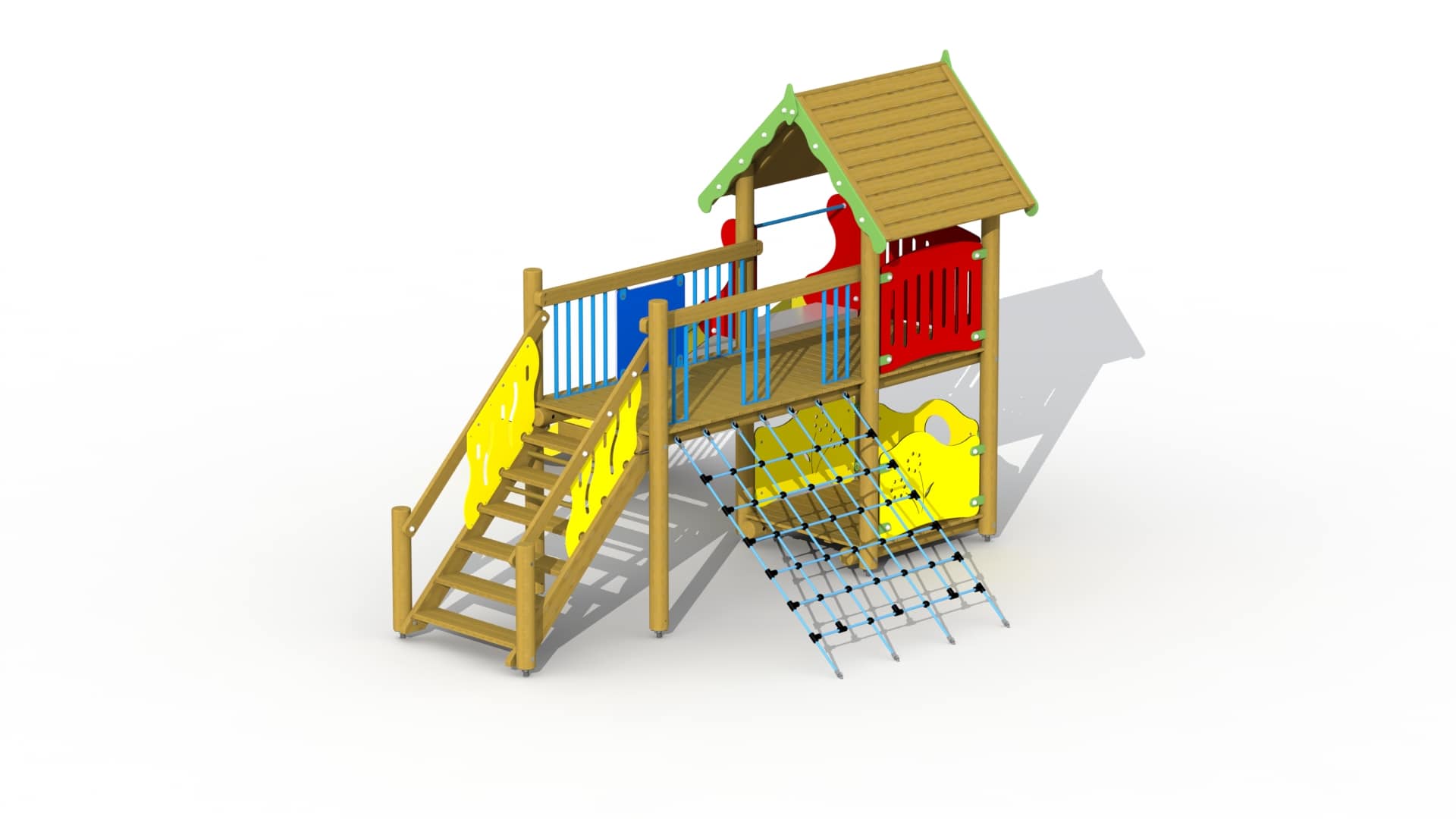 Een toestel met een langwerpig platform dat gedeeltelijk met een zadeldak bedekt is, geschikt voor kinderen van 3 tot 12 jaar. Het platform kan bereikt worden langs een schuingeplaatst klimnet of langs een gemakkelijke trap. Bovenaan kan het platform verlaten…
