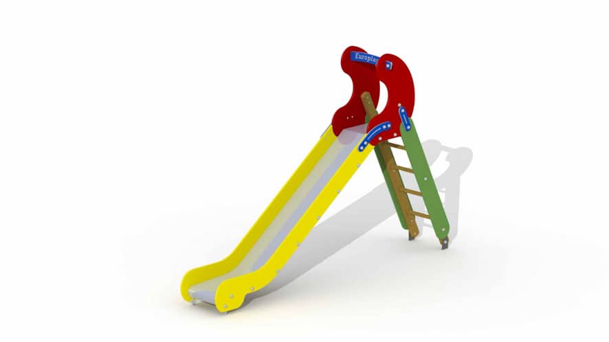 Vrijstaande kleurrijke glijbaan voor kinderen van 4 tot 12 jaar. De glijbaan is opgebouwd uit 19 mm dikke gekleurde HDPE polyethyleen glijboorden. De glijplaat met startzone op 0,9 m is opgebouwd uit 1,5 mm dik roestvrij staal. Het toestel is beklimbaar via een ladder opgebouwd uit eiken zijplanken met laddersporten in es. De ladder is afgewerkt met 19 mm dikke gekleurde HDPE polyethyleen zijboorden. Alle metaalonderdelen zijn roestvrij voorbehandeld en alle moeren en bouten zijn volledig afgeschermd met kunststof bloemvormige afdekdoppen.