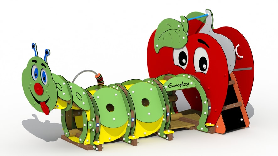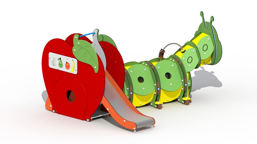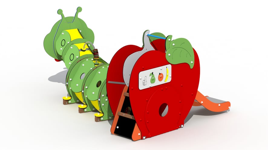 Een kleurrijk speeltoestel met een thema dat kinderen, maar ook volwassenen, uitnodigt tot het eten van gezonde voeding en tegelijkertijd de beweging stimuleert.De Rups is een speeltoestel voor kinderen van 2 tot 7 jaar in de vorm van een doorkruiprups met een glijbaan en een klimmuur opgebouwd in de vorm van een appel. Het toestel heeft een valhoogte van 1 m.De appel bestaande uit een glijbaan met HDPE polyethyleen glijboorden, een klimmuur en een telraam uit HDPE polyethyleen schijven. De metalen onderdelen zijn roestvrij behandeld en alle moeren en bouten worden afgeschermd door kunststof afdekdoppen.Op de rups kunnen vooraan optioneel twee extra spelpanelen bevestigd worden: schuifpuzzel (ref.L719) en/of vier op een rij (ref.L720).
