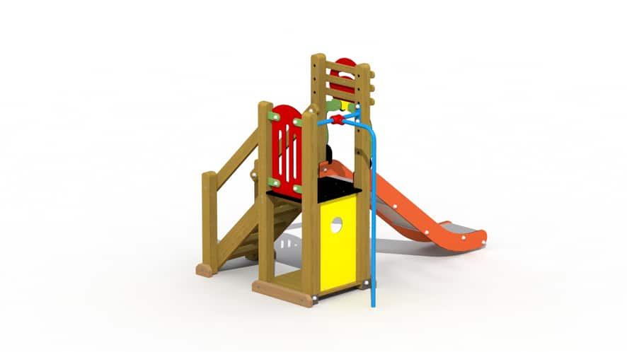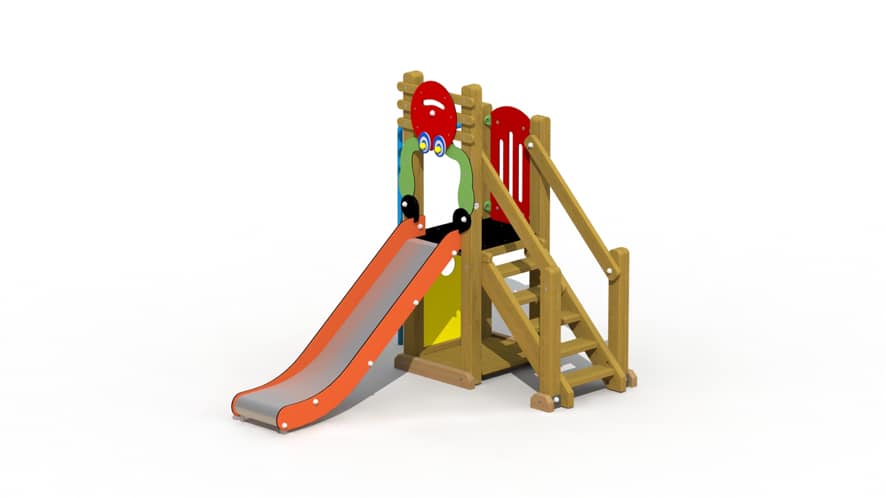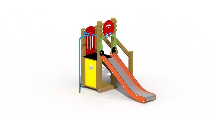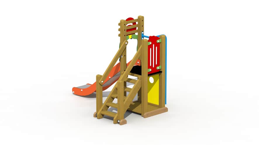 Een kleurrijk speeltoestel voor kinderen van 2 tot 6 jaar. Het speeltoestel is opgebouwd uit een plankenvloer en 1 platform, op een hoogte van 85 cm, dat bereikt kan worden via een gemakkelijke houten trap. De vloerplanken hebben een dikte van 22mm. Vanop het platform kan naar beneden gegleden worden via een kunststof glijbaan en via een spiraalglijstang. Het toestel wordt grotendeels voorgemonteerd geleverd met bevestigingsijzers en mag op gras geplaatst worden. De lariks vierkantpalen (9 x 9 cm) worden met metalen gegalvaniseerde voetsteunen in of op de grond bevestigd. De onderste liggers zijn in eik. Alle metalen onderdelen zijn roestvrij voorbehandeld en alle moeren en bouten zijn volledig afgeschermd met kunststof bloemvormige afdekdoppen.