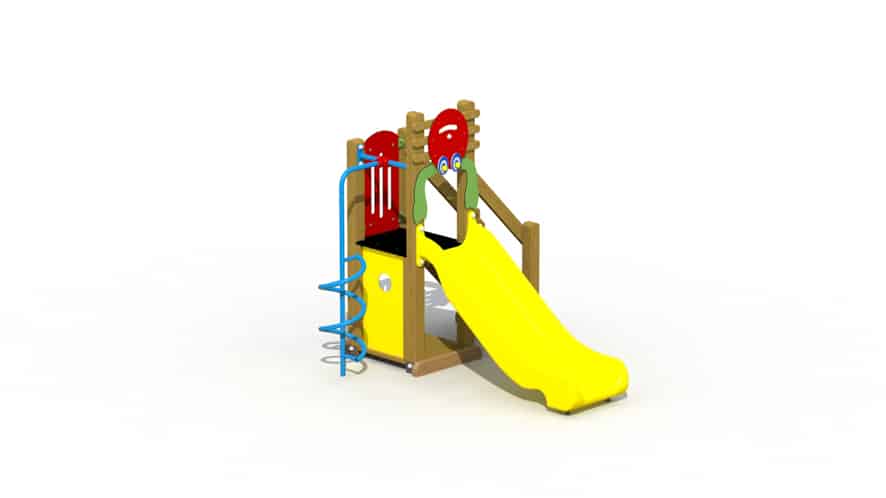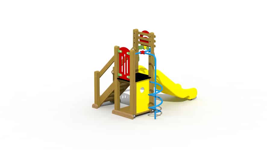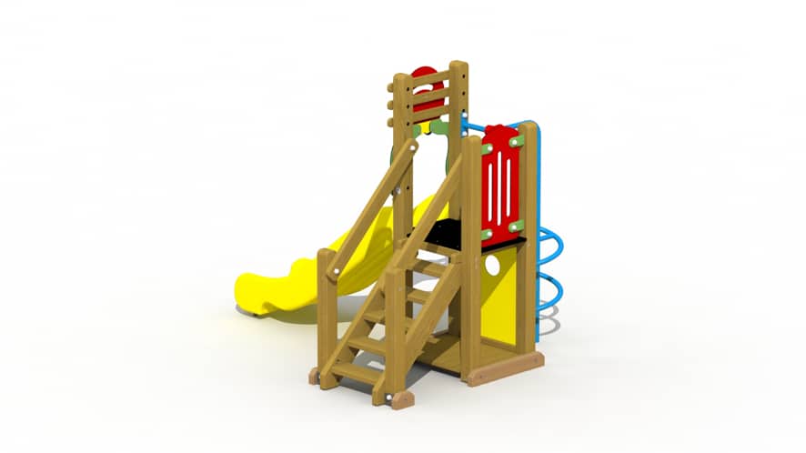 Een kleurrijk speeltoestel voor kinderen van 2 tot 6 jaar. Het speeltoestel is opgebouwd uit een plankenvloer en 1 platform, op een hoogte van 85 cm, dat bereikt kan worden via een gemakkelijke houten trap. De vloerplanken hebben een dikte van 22mm. Vanop het platform kan naar beneden gegleden worden via een kunststof glijbaan en via een spiraalglijstang. Het toestel wordt grotendeels voorgemonteerd geleverd met bevestigingsijzers en mag op gras geplaatst worden. De lariks vierkantpalen (9 x 9 cm) worden met metalen gegalvaniseerde voetsteunen in of op de grond bevestigd. De onderste liggers zijn in eik. Alle metalen onderdelen zijn roestvrij voorbehandeld en alle moeren en bouten zijn volledig afgeschermd met kunststof bloemvormige afdekdoppen.
