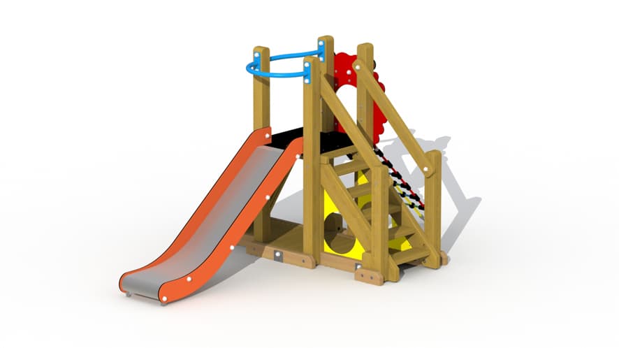 Een kleurrijk speeltoestel voor kinderen van 2 tot 6 jaar. Het speeltoestel is opgebouwd uit een plankenvloer en 1 platform, op een hoogte van 85 cm. Dit platform kan bereikt worden via een gemakkelijke houten trap, een klimmuur met kunststof klimgrepen en een kleurrijk klimnet. Aan de zijde van het klimnet is er een ronde opening voorzien waar de kinderen kunnen doorkruipen. De vloerplanken hebben een dikte van 22 mm. Vanop het platform kan naar beneden gegleden worden via een inox glijbaan met HDPE polyethyleen zijwanden. Het toestel wordt grotendeels voorgemonteerd geleverd met bevestigingsijzers en mag op gras geplaatst worden. De lariks vierkantpalen (9 x 9 cm) worden met metalen gegalvaniseerde voetsteunen in of op de grond bevestigd. De onderste liggers zijn in eik. Alle metalen onderdelen zijn roestvrij voorbehandeld en alle moeren en bouten zijn volledig afgeschermd met kunststof bloemvormige afdekdoppen.