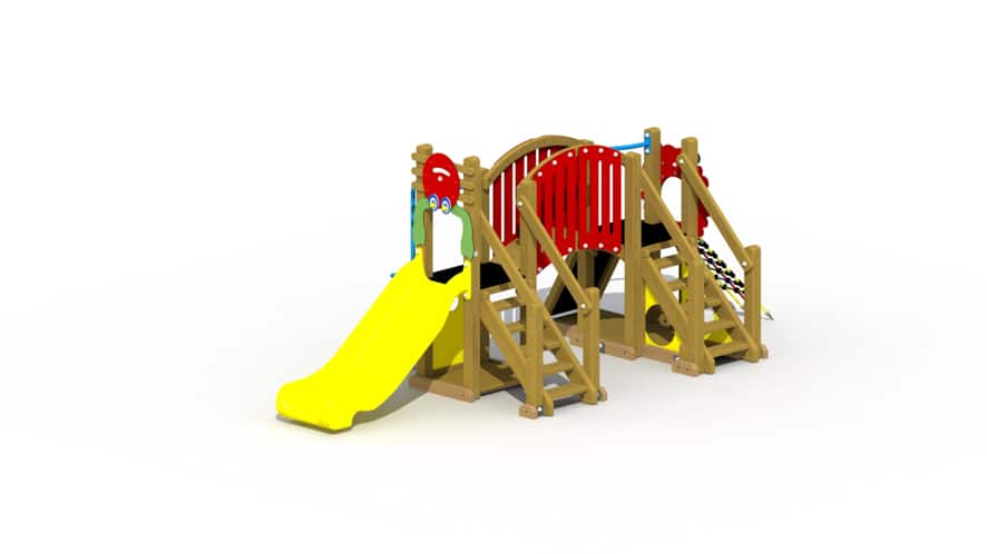 Een kleurrijk speeltoestel voor kinderen van 2 tot 6 jaar. Dit speeltoestel is een combinatie van het kreeftje en het leeuwenhol. Het speeltoestel bestaat uit 2 delen die met elkaar verbonden worden door middel van een gebogen loopbrug. Het eerste deel is opgebouwd uit een plankenvloer en 1 platform, op een hoogte van 85 cm, dat bereikt kan worden via een gemakkelijke houten trap. Vanop het platform kan naar beneden gegleden worden via een kunststof glijbaan of een spiraalglijstang. Het tweede deel is eveneens opgebouwd uit een plankenvloer en 1 platform, op een hoogte van 85 cm. Dit platform kan bereikt worden via een gemakkelijke houten trap, een klimmuur met kunststof klimgrepen en een kleurrijk klimnet. Aan de zijde van het klimnet is er een ronde opening voorzien waar de kinderen kunnen doorkruipen. De vloerplanken hebben een dikte van 22 mm.