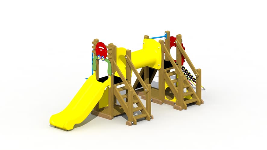 Een kleurrijk speeltoestel voor kinderen van 2 tot 6 jaar. Dit speeltoestel is een combinatie van het kreeftje en het leeuwenhol. Het speeltoestel bestaat uit 2 delen die met elkaar verbonden worden door middel van een kruiptunnel uit HDPE polyethyleen. Het eerste deel is opgebouwd uit een plankenvloer en 1 platform, op een hoogte van 85 cm, dat bereikt kan worden via een gemakkelijke houten trap. Vanop het platform kan naar beneden gegleden worden via een kunststof glijbaan of een spiraalglijstang. Het tweede deel is eveneens opgebouwd uit een plankenvloer en 1 platform, op een hoogte van 85 cm. Dit platform kan bereikt worden via een gemakkelijke houten trap, een klimmuur met kunststof klimgrepen en een kleurrijk klimnet. Aan de zijde van het klimnet is er een ronde opening voorzien waar de kinderen kunnen doorkruipen.