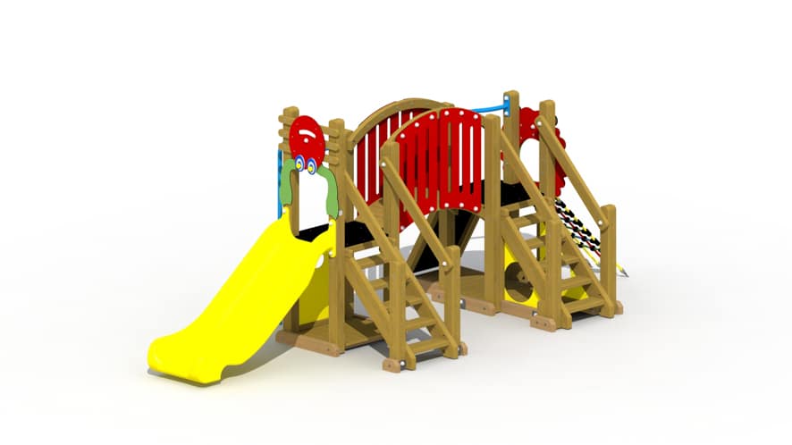 Een kleurrijk speeltoestel voor kinderen van 2 tot 6 jaar. Dit speeltoestel is een combinatie van het kreeftje en het leeuwenhol. Het speeltoestel bestaat uit 2 delen die met elkaar verbonden worden door middel van een kruiptunnel uit HDPE polyethyleen. Het eerste deel is opgebouwd uit een plankenvloer en 1 platform, op een hoogte van 85 cm, dat bereikt kan worden via een gemakkelijke houten trap. Vanop het platform kan naar beneden gegleden worden via een inox glijbaan met HDPE polyethyleen zijwanden of een rechte glijstang. Het tweede deel is eveneens opgebouwd uit een plankenvloer en 1 platform, op een hoogte van 85 cm. Dit platform kan bereikt worden via een gemakkelijke houten trap, een klimmuur met kunststof klimgrepen en een kleurrijk klimnet. Aan de zijde van het klimnet is er een ronde opening voorzien waar de kinderen kunnen doorkruipen.