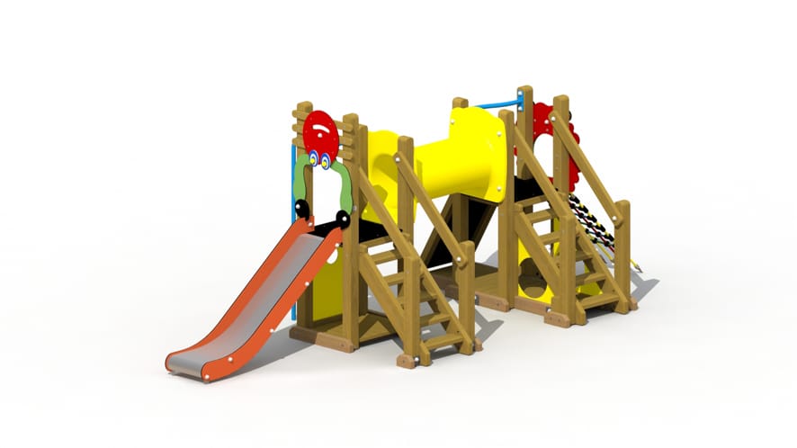 Een kleurrijk speeltoestel voor kinderen van 2 tot 6 jaar. Dit speeltoestel is een combinatie van het kreeftje en het leeuwenhol. Het speeltoestel bestaat uit 2 delen die met elkaar verbonden worden door middel van een kruiptunnel uit HDPE polyethyleen. Het eerste deel is opgebouwd uit een plankenvloer en 1 platform, op een hoogte van 85 cm, dat bereikt kan worden via een gemakkelijke houten trap. Vanop het platform kan naar beneden gegleden worden via een inox glijbaan met HDPE polyethyleen zijwanden of een rechte glijstang. Het tweede deel is eveneens opgebouwd uit een plankenvloer en 1 platform, op een hoogte van 85 cm. Dit platform kan bereikt worden via een gemakkelijke houten trap, een klimmuur met kunststof klimgrepen en een kleurrijk klimnet. Aan de zijde van het klimnet is er een ronde opening voorzien waar de kinderen kunnen doorkruipen.