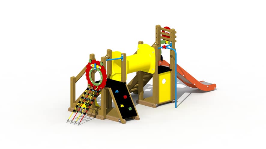 Een kleurrijk speeltoestel voor kinderen van 2 tot 6 jaar. Dit speeltoestel is een combinatie van het kreeftje en het leeuwenhol. Het speeltoestel bestaat uit 2 delen die met elkaar verbonden worden door middel van een kruiptunnel uit HDPE polyethyleen. Het eerste deel is opgebouwd uit een plankenvloer en 1 platform, op een hoogte van 85 cm, dat bereikt kan worden via een gemakkelijke houten trap. Vanop het platform kan naar beneden gegleden worden via een inox glijbaan met HDPE polyethyleen zijwanden of een rechte glijstang. Het tweede deel is eveneens opgebouwd uit een plankenvloer en 1 platform, op een hoogte van 85 cm. Dit platform kan bereikt worden via een gemakkelijke houten trap, een klimmuur met kunststof klimgrepen en een kleurrijk klimnet. Aan de zijde van het klimnet is er een ronde opening voorzien waar de kinderen kunnen doorkruipen.