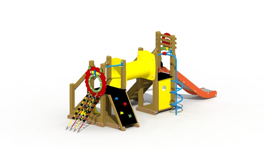 Een kleurrijk speeltoestel voor kinderen van 2 tot 6 jaar. Dit speeltoestel is een combinatie van het kreeftje en het leeuwenhol. Het speeltoestel bestaat uit 2 delen die met elkaar verbonden worden door middel van een kruiptunnel uit HDPE polyethyleen. Het eerste deel is opgebouwd uit een plankenvloer en 1 platform, op een hoogte van 85 cm, dat bereikt kan worden via een gemakkelijke houten trap. Vanop het platform kan naar beneden gegleden worden via een inox glijbaan met polyethyleen zijwanden of een spiraalglijstang. Het tweede deel is eveneens opgebouwd uit een plankenvloer en 1 platform, op een hoogte van 85 cm. Dit platform kan bereikt worden via een gemakkelijke houten trap, een klimmuur met kunststof klimgrepen en een kleurrijk klimnet.