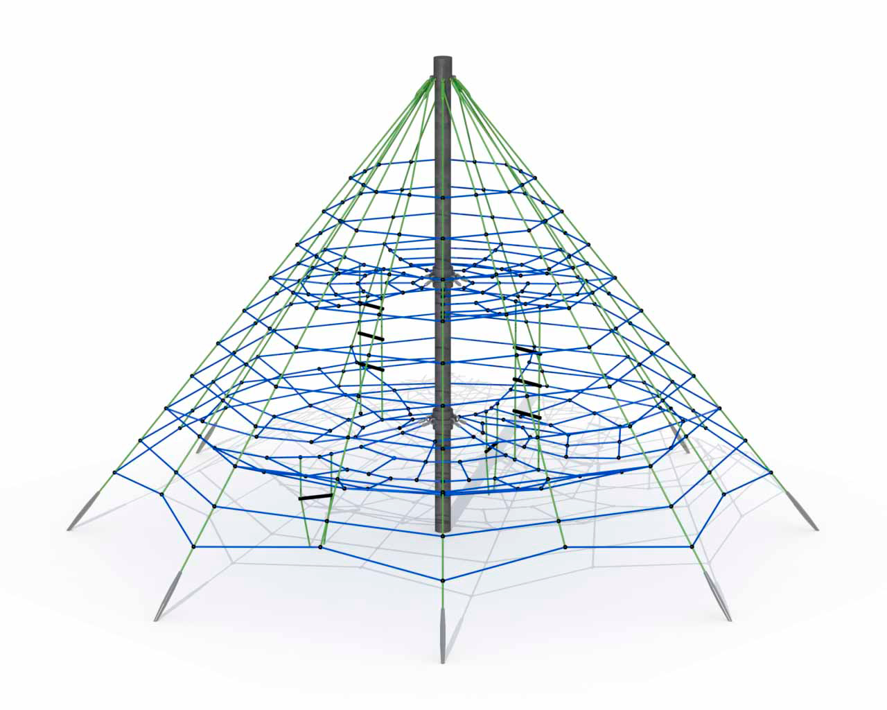 Ruimtenet voor kinderen van 4 tot 16 jaar. Het net is volledig opgebouwd uit polypropyleen touw en wordt aan de uiteinden met 8 gegalvaniseerde grondankers in de grond bevestigd. Het ruimtenet hangt rond een gegalvaniseerde metalen paal die rechtstreeks in de grond met beton verankerd wordt. Binnenin het ruimtenet kan je via vier touwladders naar verschillende niveaus klimmen. Hiervoor zijn speciale doorkruiptunnels in de horizontale netten voorzien. Op de twee horizontale lignetten kan je even uitrusten alvorens de klimtocht verder te zetten.