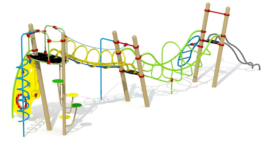 Uitdagend eigentijds klimtoestel voor kinderen van 6-15 jaar. Het speeltoestel is opgebouwd uit 2 verticale palen met een diameter van respectievelijk 89 en 127 mm. Het toestel kan beklommen worden via een wenteltrap met ronde HDPE polyethyleen treden of via een gebogen klimmuur opgebouwd uit een HDPE polyethyleen paneel met diverse klim- en doorkruipmogelijkheden. De klimmuur is langs beide zijden voorzien van kunststof klimgrepen en wordt bevestigd met behulp van een aluminium bevestigingsklem. Bovenaan het speeltoestel bevindt zich een groot uitkijkplatform. De balustrade bovenaan het platform is opgebouwd uit 34mm dikke gebogen buizen die onderling verbonden zijn door middel van klemverbindingen uit polyamide. Vanop het platform kan naar beneden gegleden worden via 2 evenwijdig golvende roestvrijstalen glijbuizen of via een verbindingstunnel met HDPE polyethyleen glijdvlak.