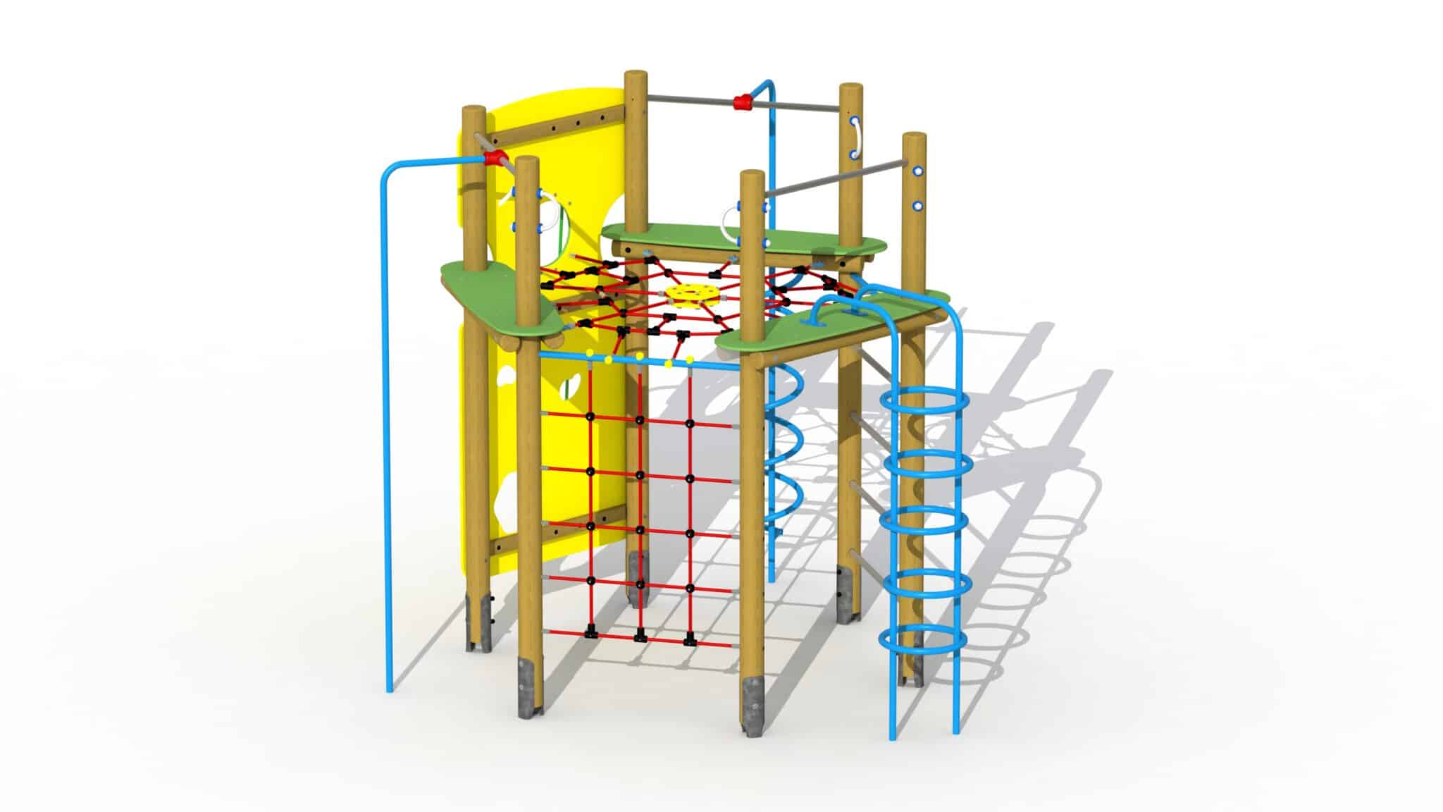 Klimtoestel in zeshoekvorm opgebouwd uit houten palen op gegalvaniseerde paalvoeten met verschillende klim- en glijfuncties. Het klimtoestel is voorzien van een verticaal klimnet, een brandweer glijstang, een spiraalglijstang, een verticale HDPE rotswand, een metalen sportenladder en een kokertrap. Bovenaan is er een horizontaal klimnet waarop uitgerust kan worden. Alle moeren en bouten zijn volledig afgeschermd met bloemvormige kunststof afdekdoppen. Het toestel wordt via de gegalvaniseerde paalvoeten met beton in de grond verankerd.